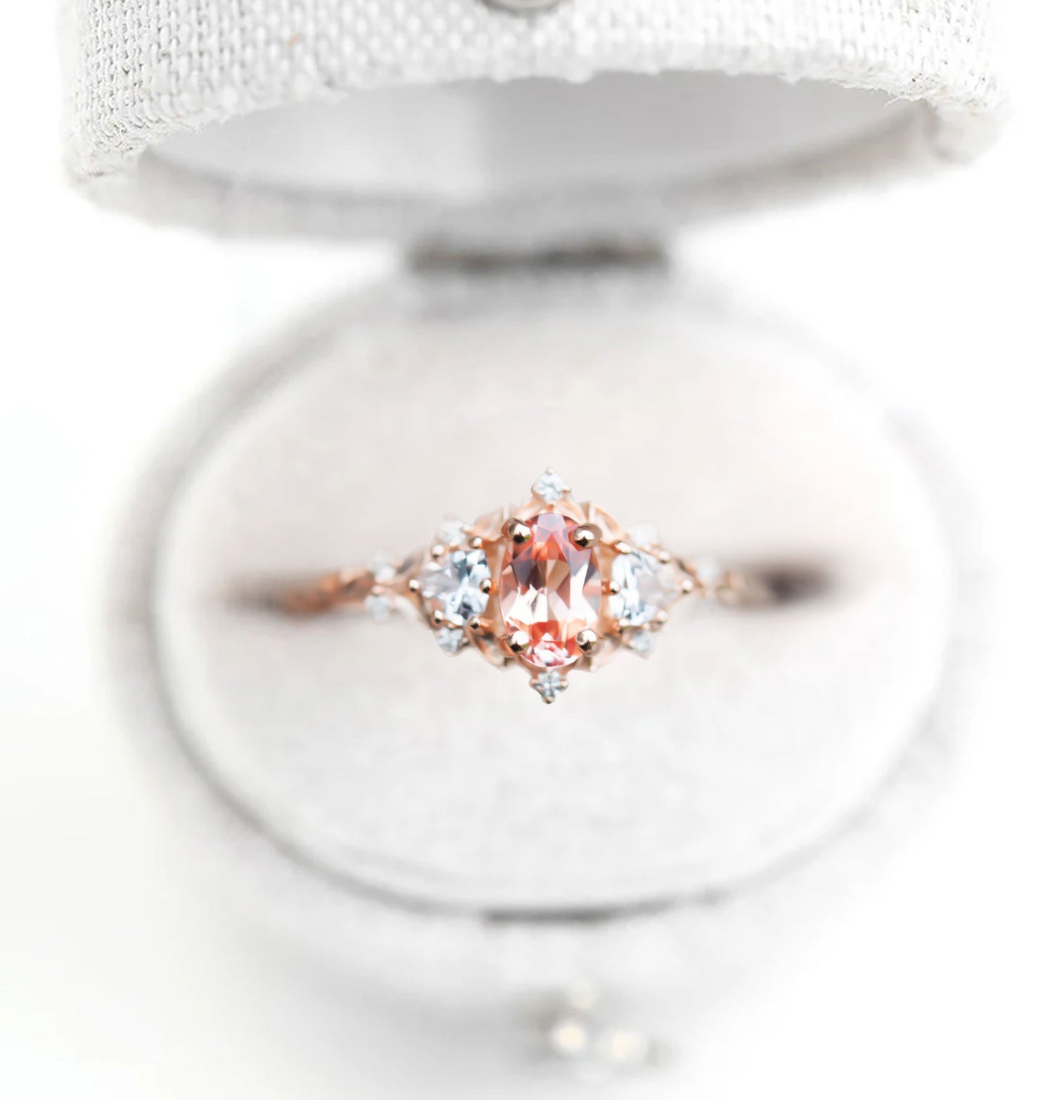 Unique Floral Rose Three Stone Oval Pink Padparadscha Ring