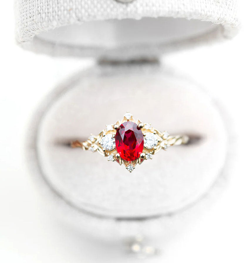 Unique Floral Rose Three Stone Oval Lab Ruby and Moissanite Ring