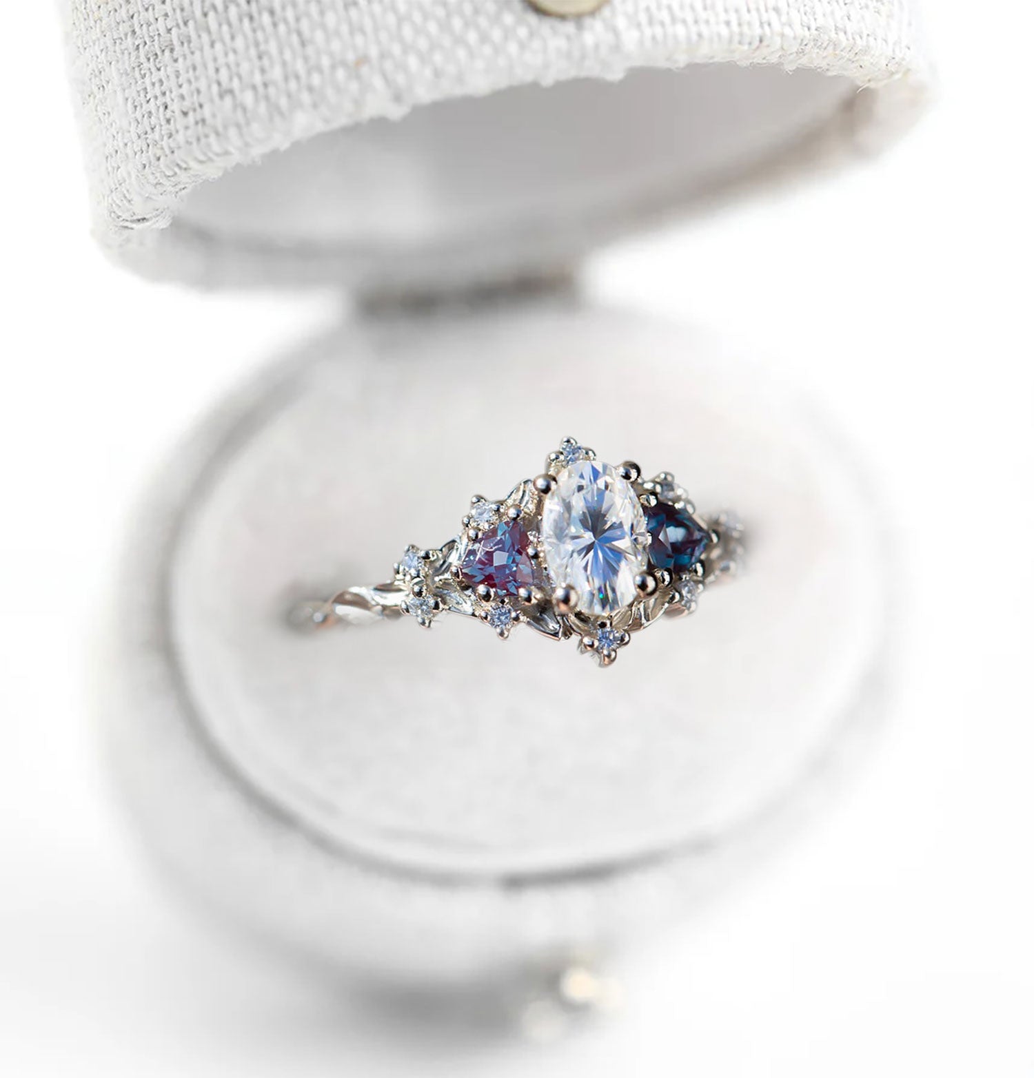 Unique Floral Rose Three Stone Oval Moissanite and Lab Alexandrite Wedding Ring