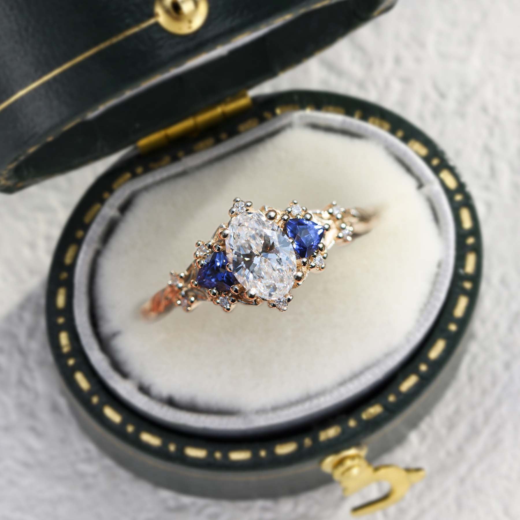 Unique Briar Rose Oval Moissanite and Lab Sapphire Ring