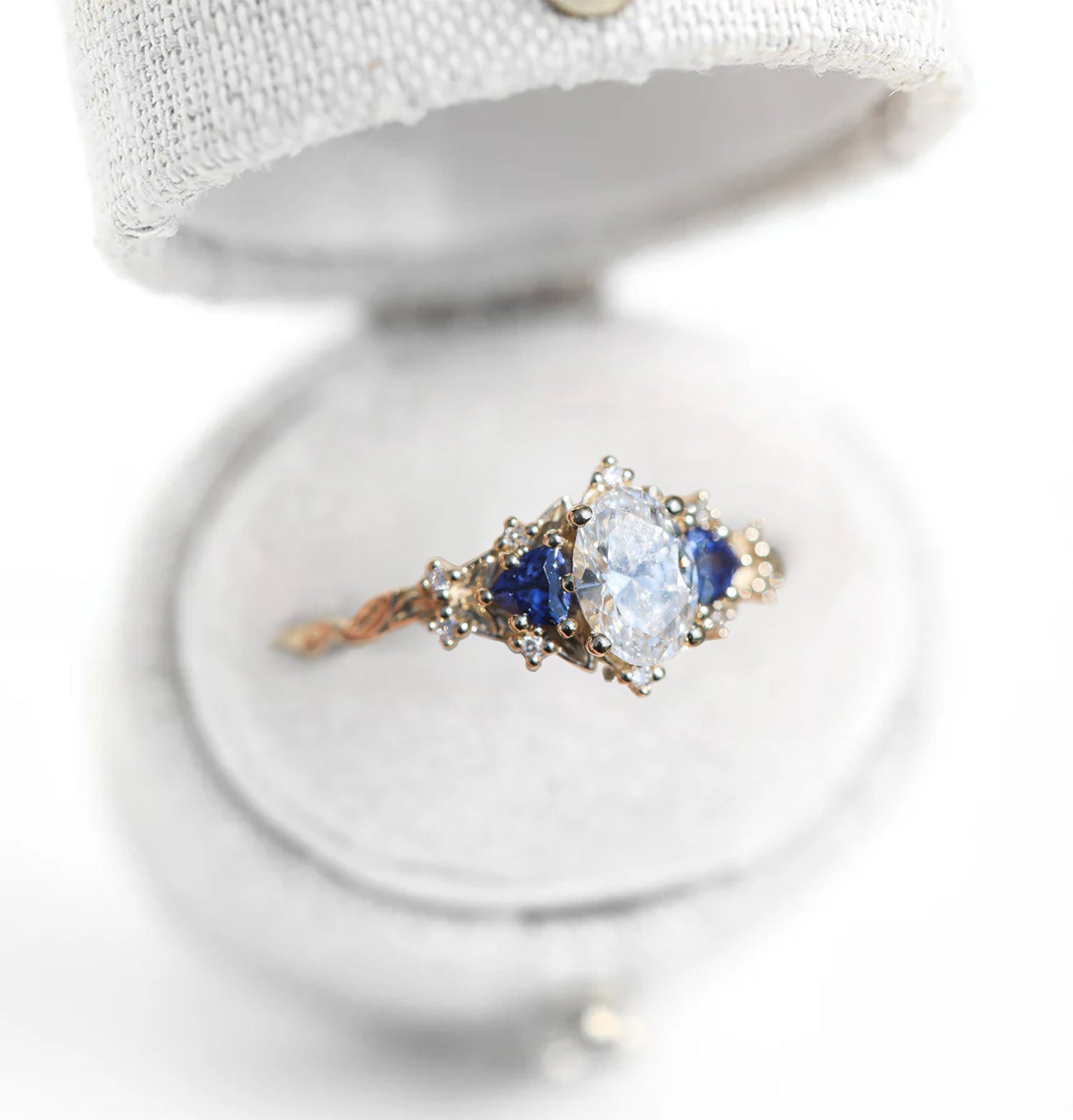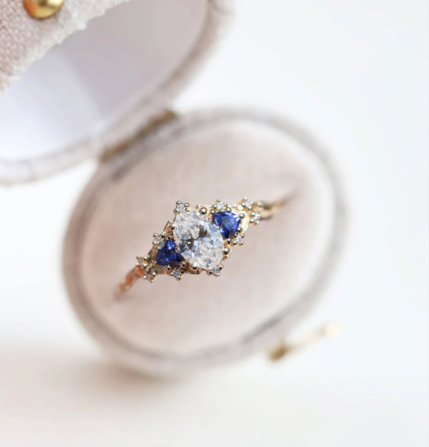 Unique Celeste Rose Oval Moissanite and Lab Sapphire Ring
