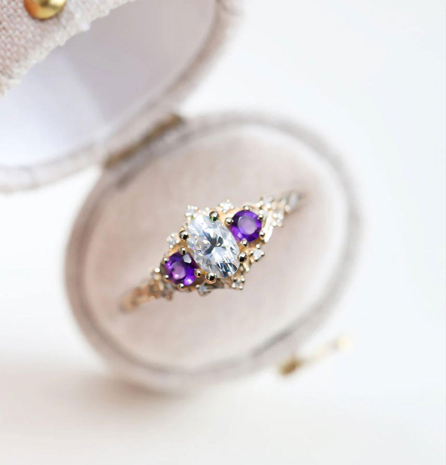 Unique Celeste Rose Oval Moissanite and Lab Amethyst Ring