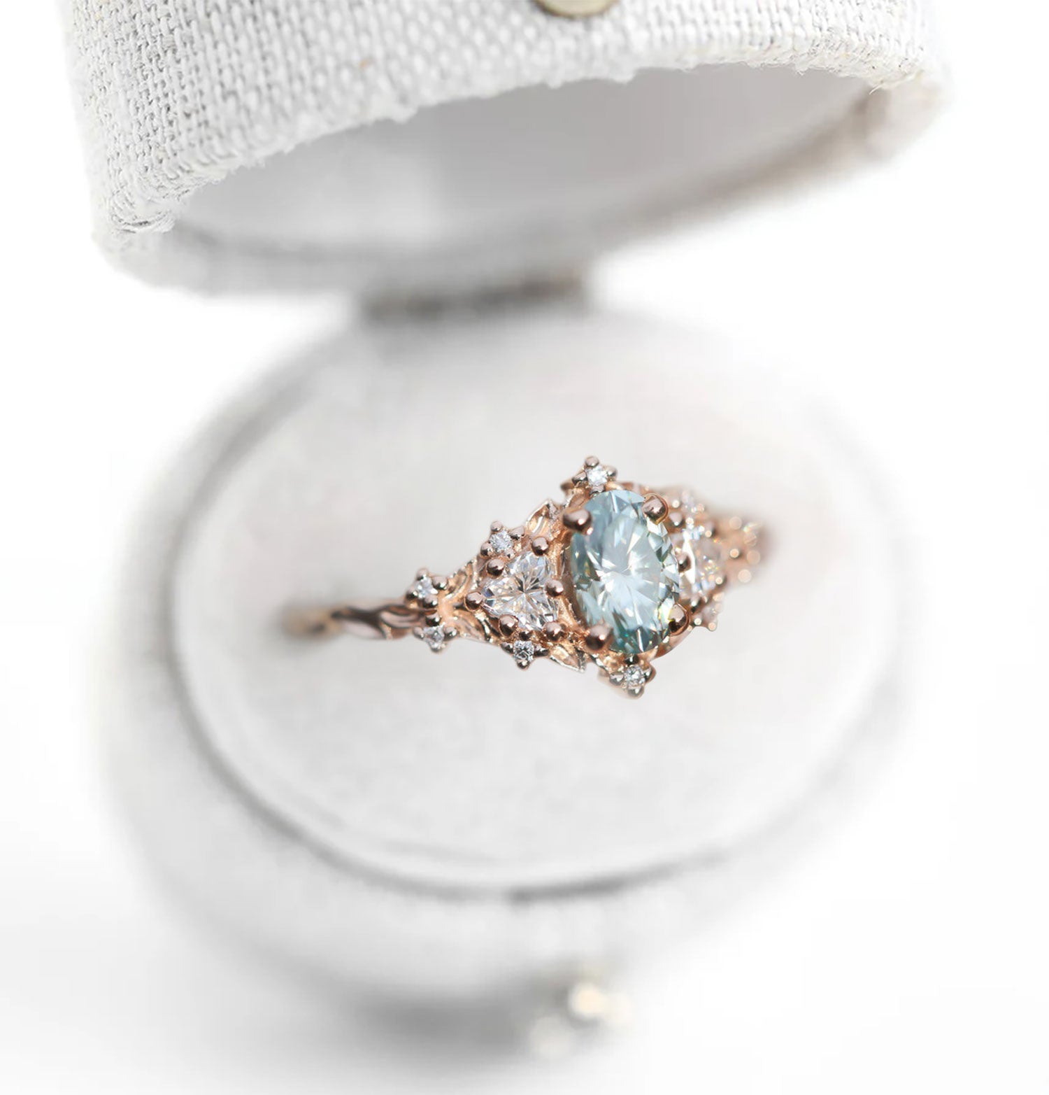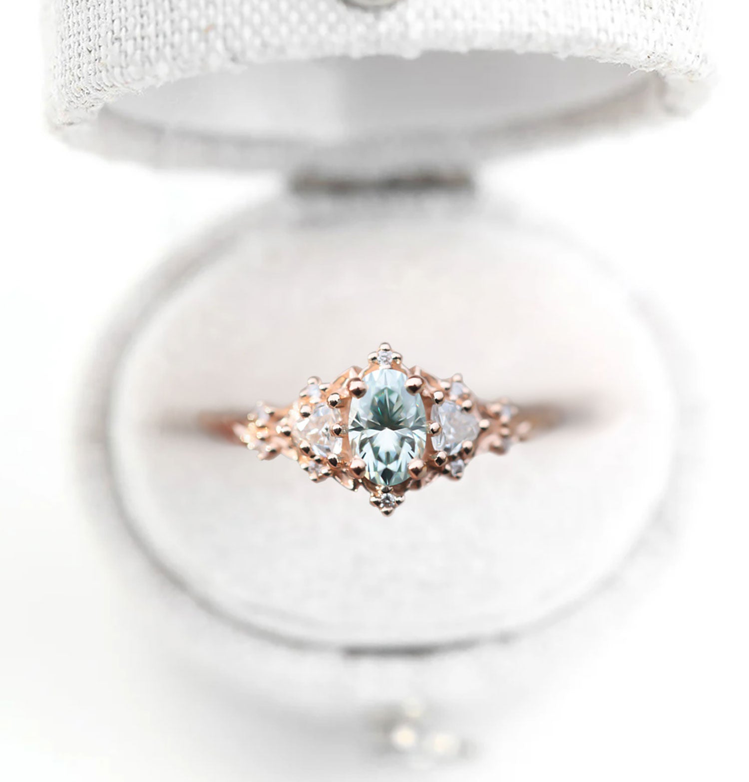 Unique Celeste Rose Three Stone Oval Teal Moissanite Ring