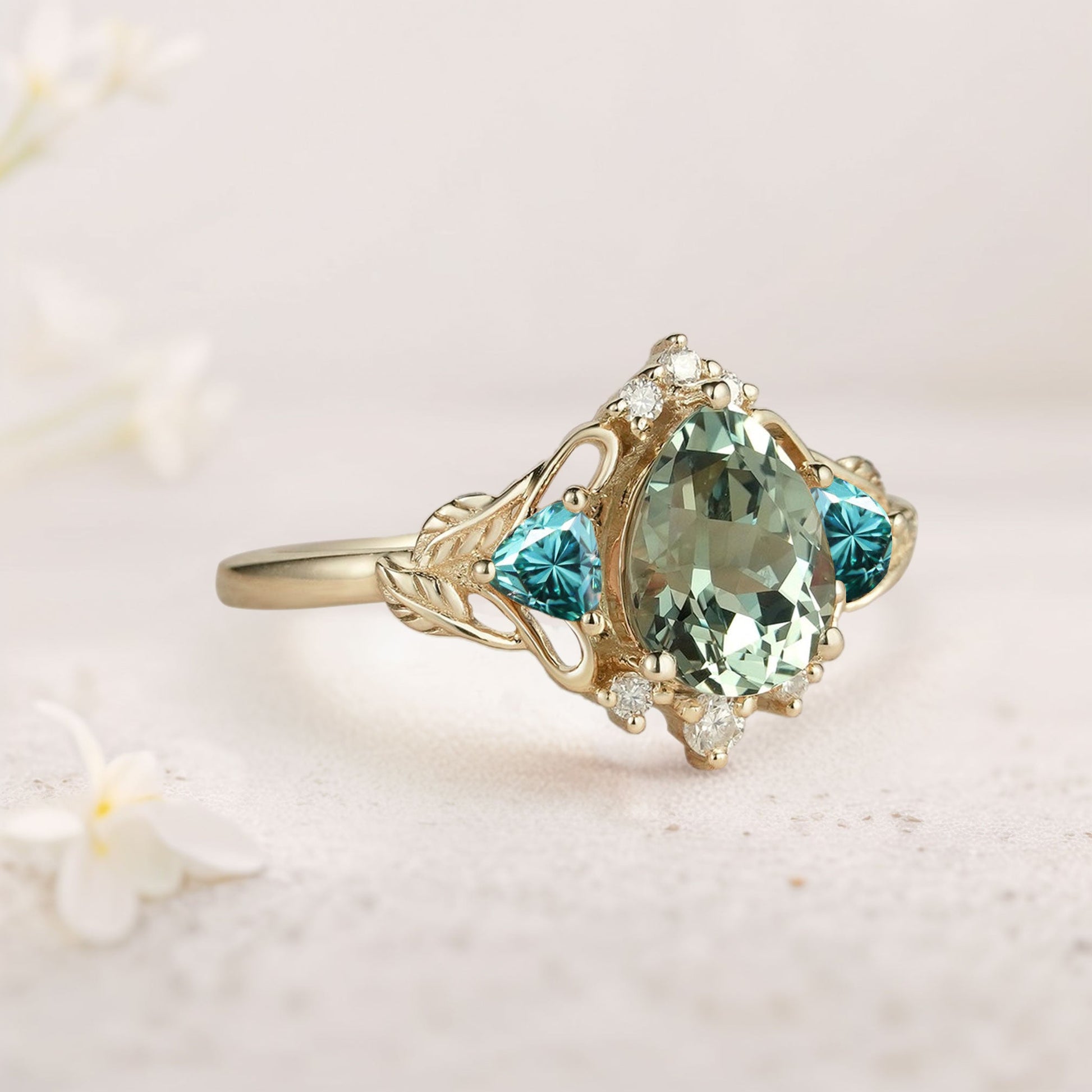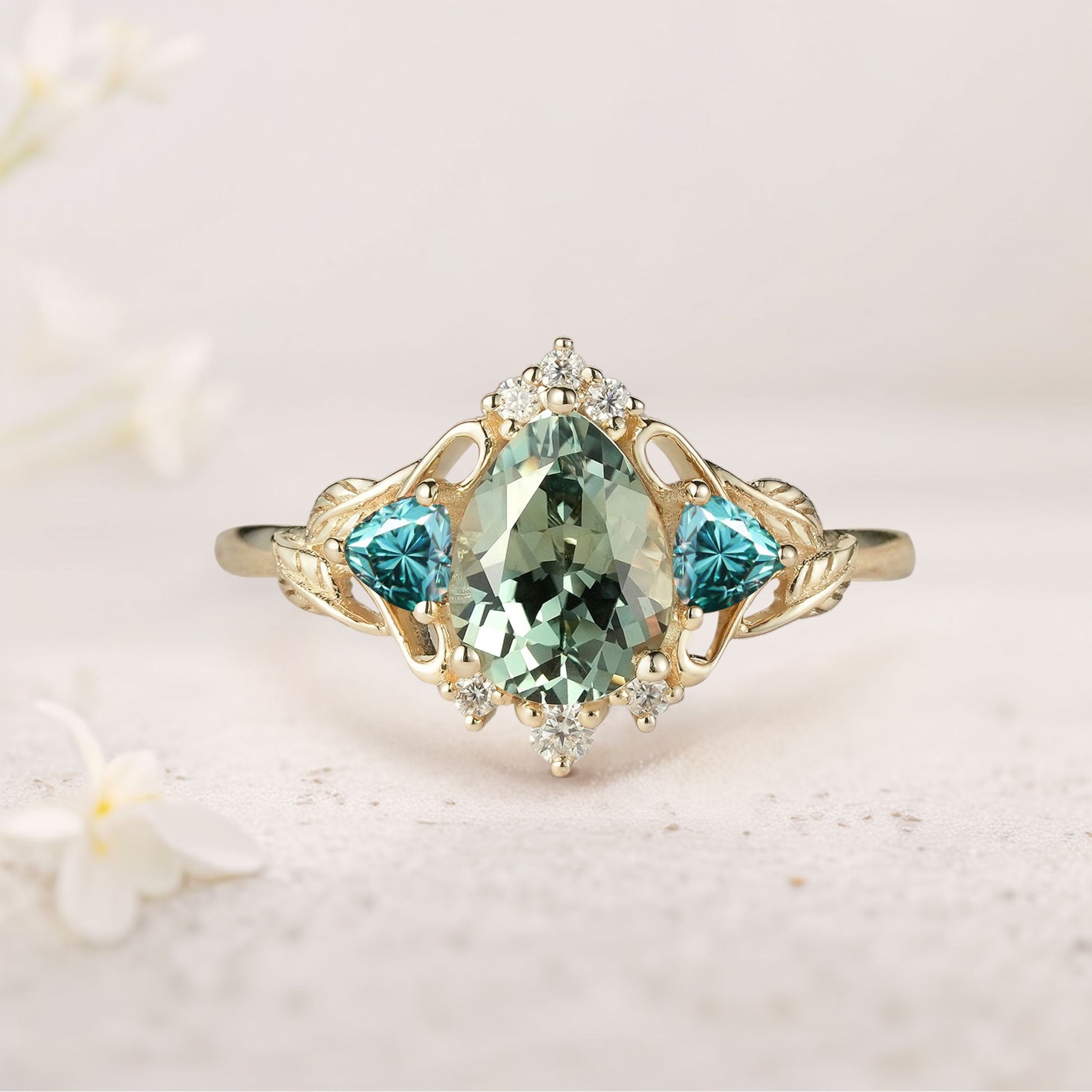 Unique Pear Green Lab Sapphire and Tear Moissanite Leaf Ring Engagement Ring