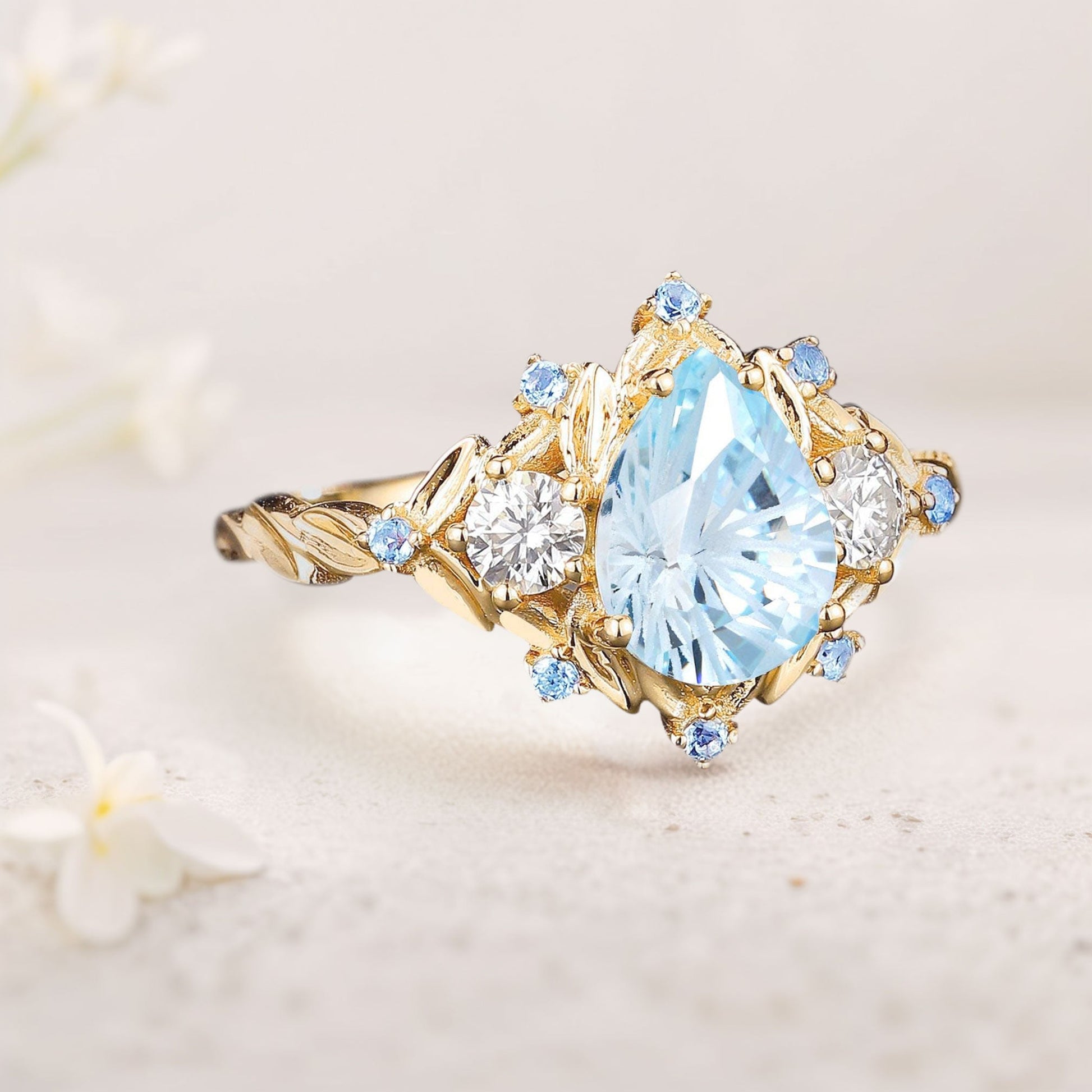 Unique Pear Lab Aquamarine Cluster Leaf Wedding Ring Handmade Anniversary Ring Gift For Women
