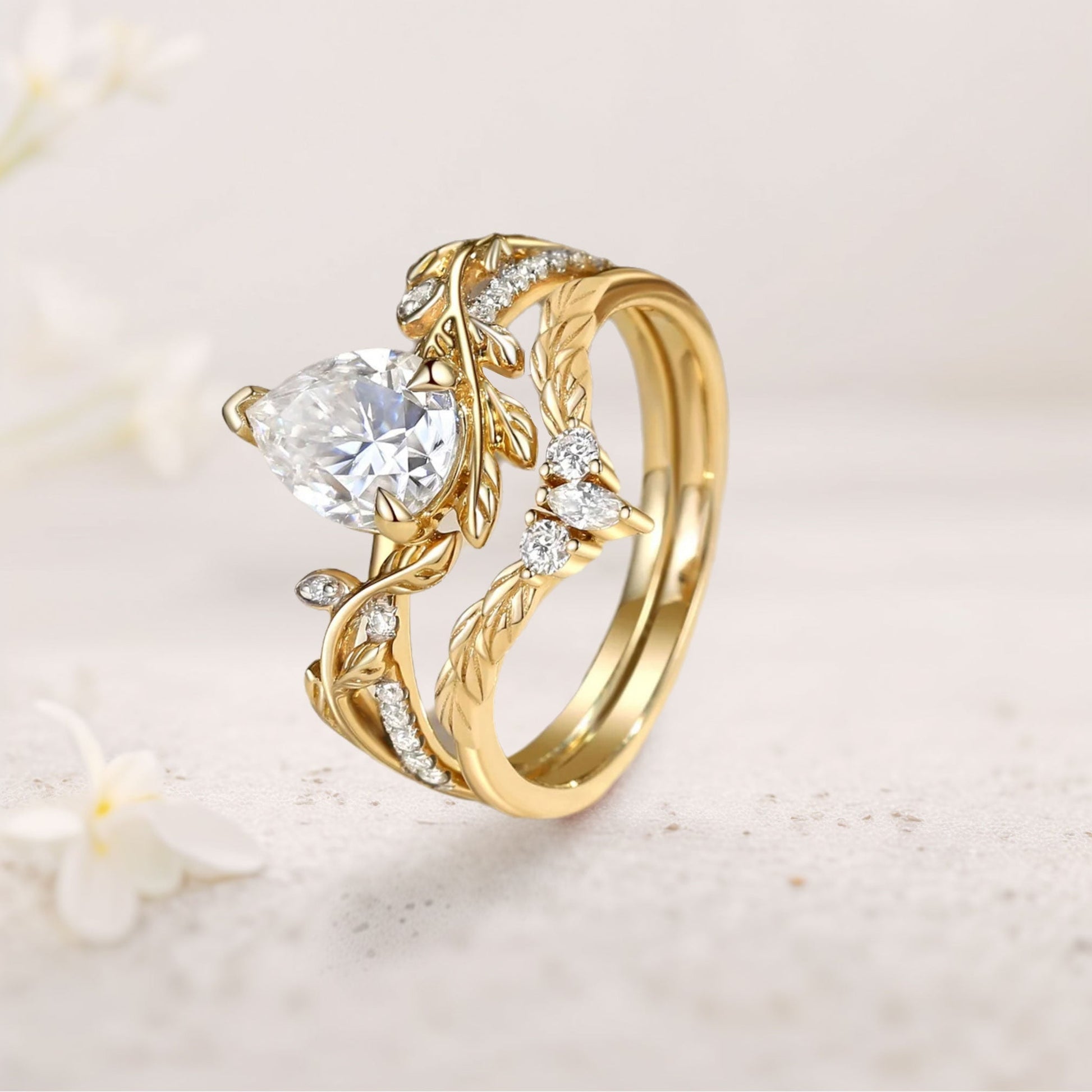 Unique floral engagement rings Pear Moissanite Nature Inspired Leafy Bridal Set