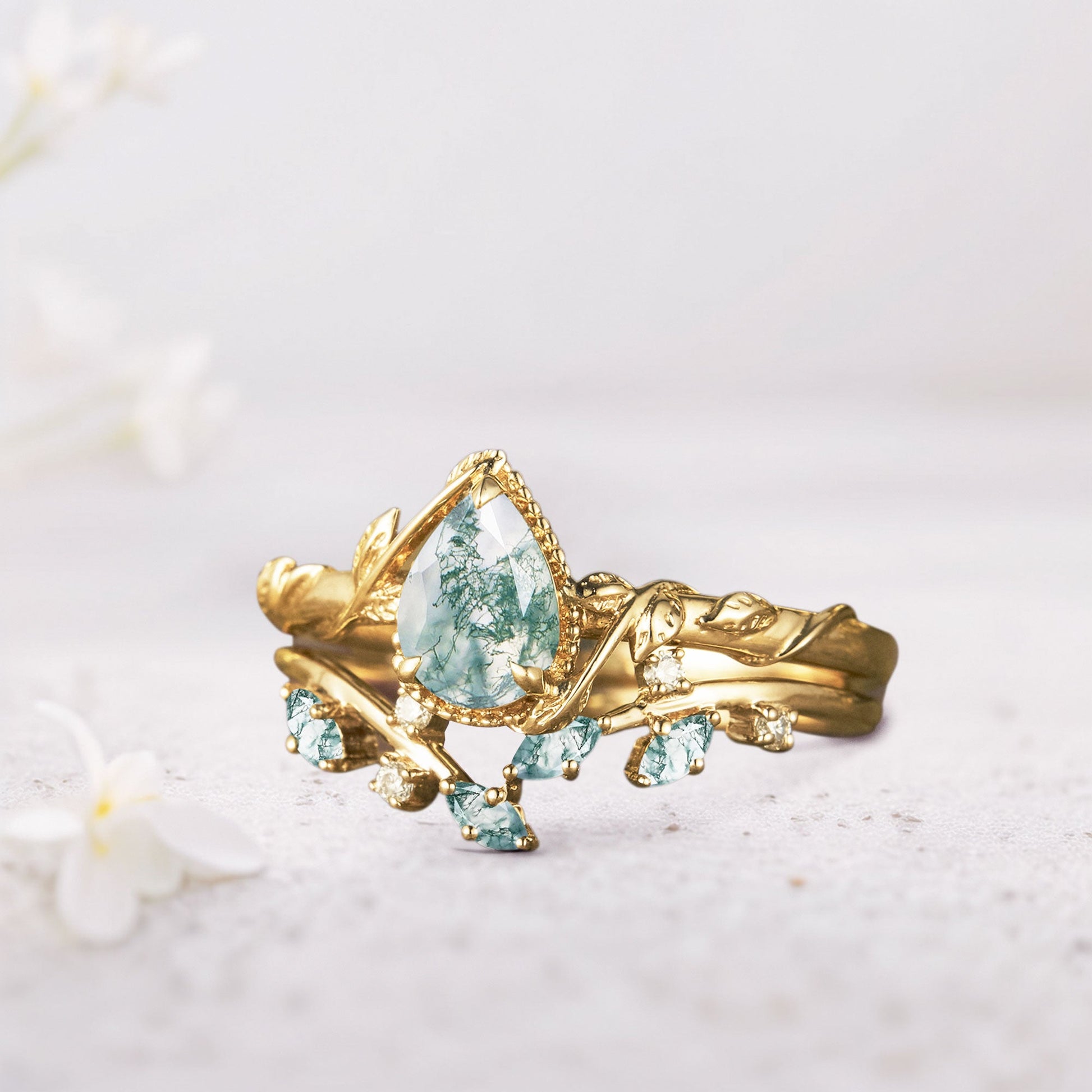 Unique Pear Moss Agate Bridal Ring Set Leaf Ring Set