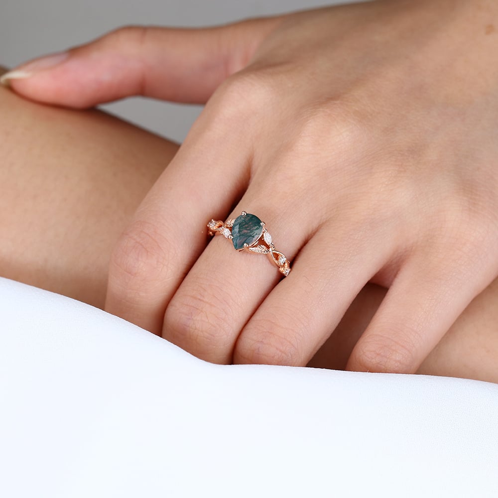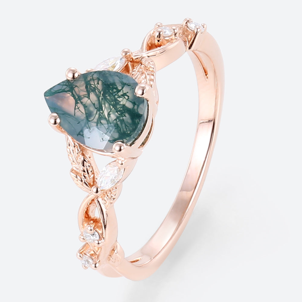 Unique Pear Moss Agate Floral Engagement Ring Nature’s Elegance Ring