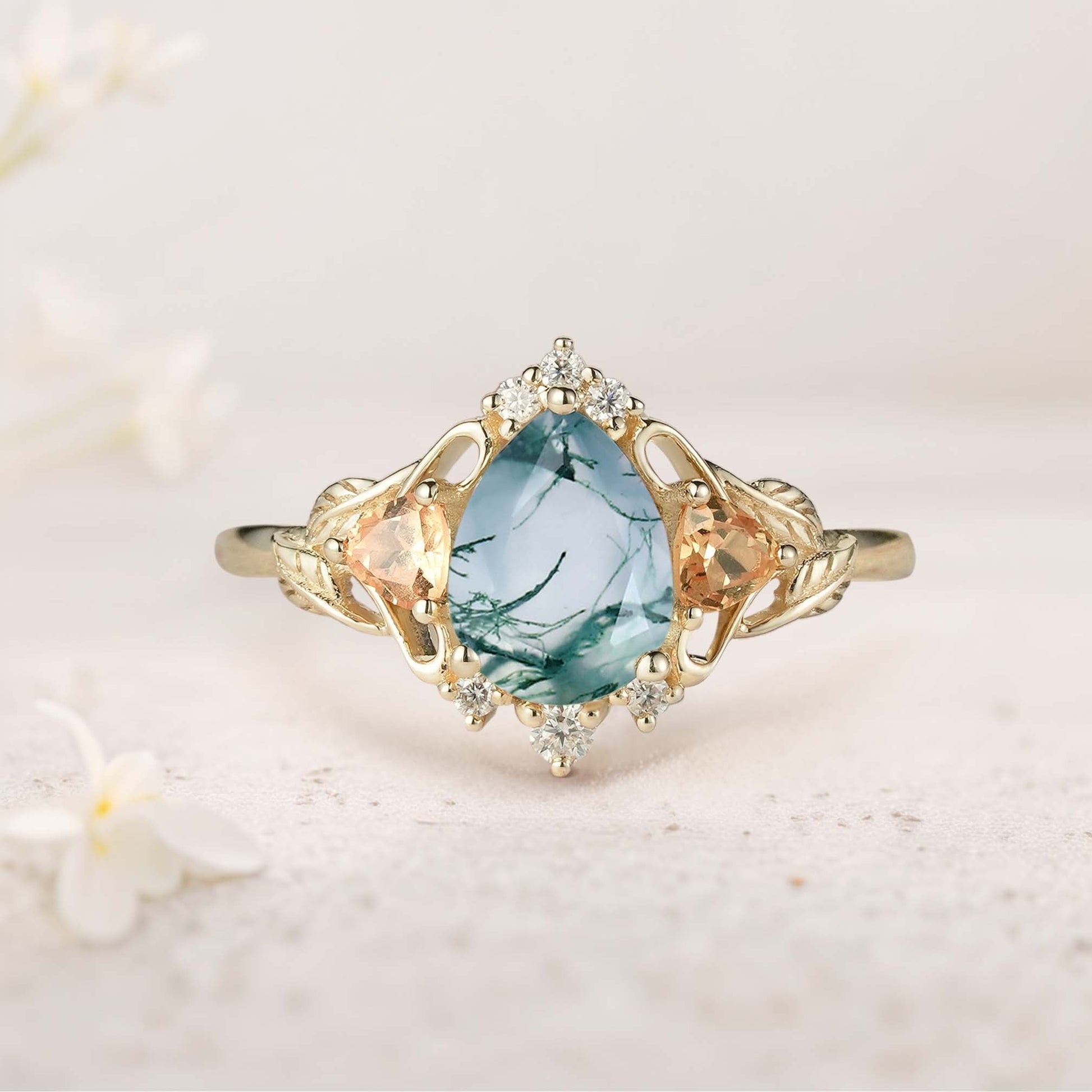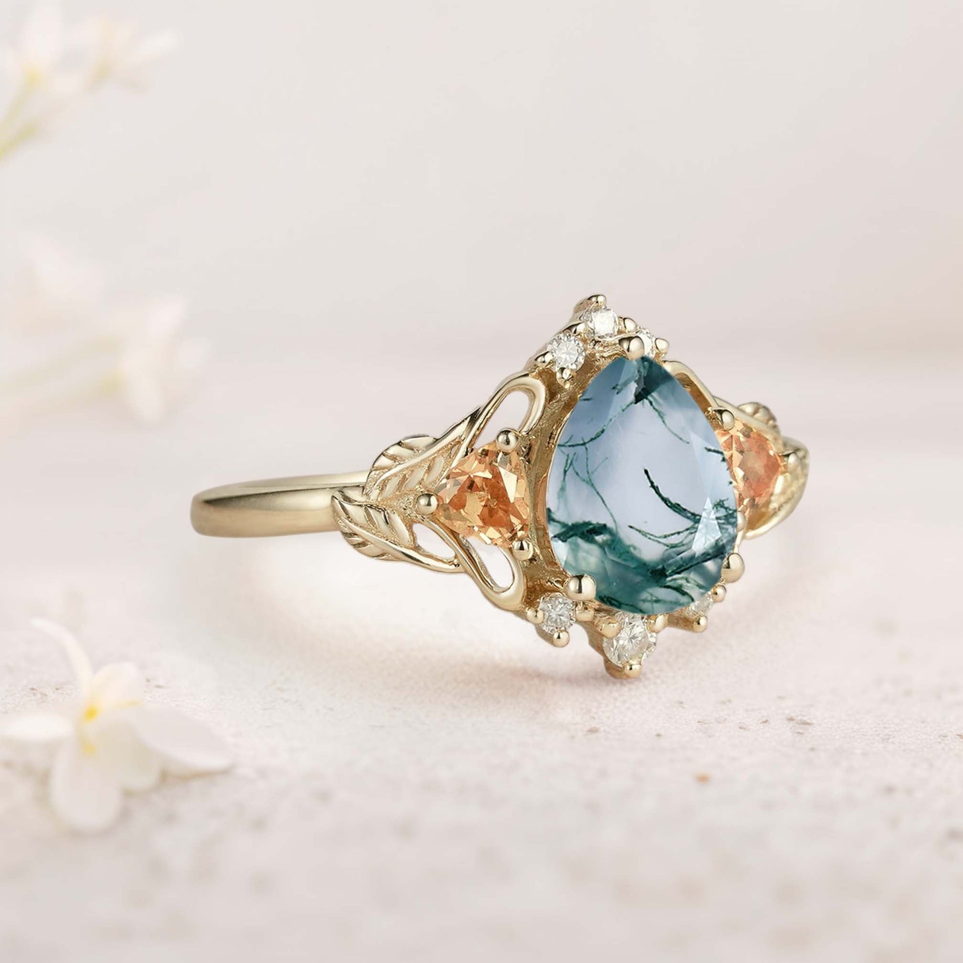 Unique Pear Moss Agate Leaf Ring Engagement Ring