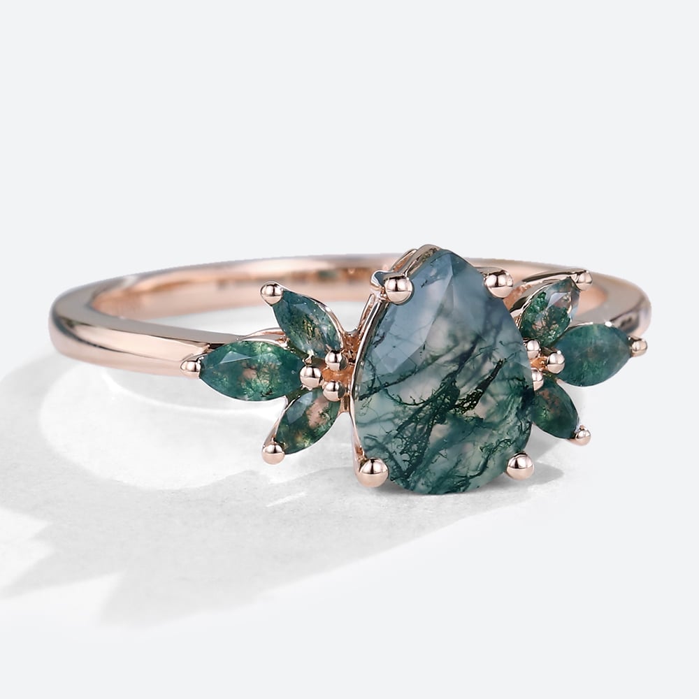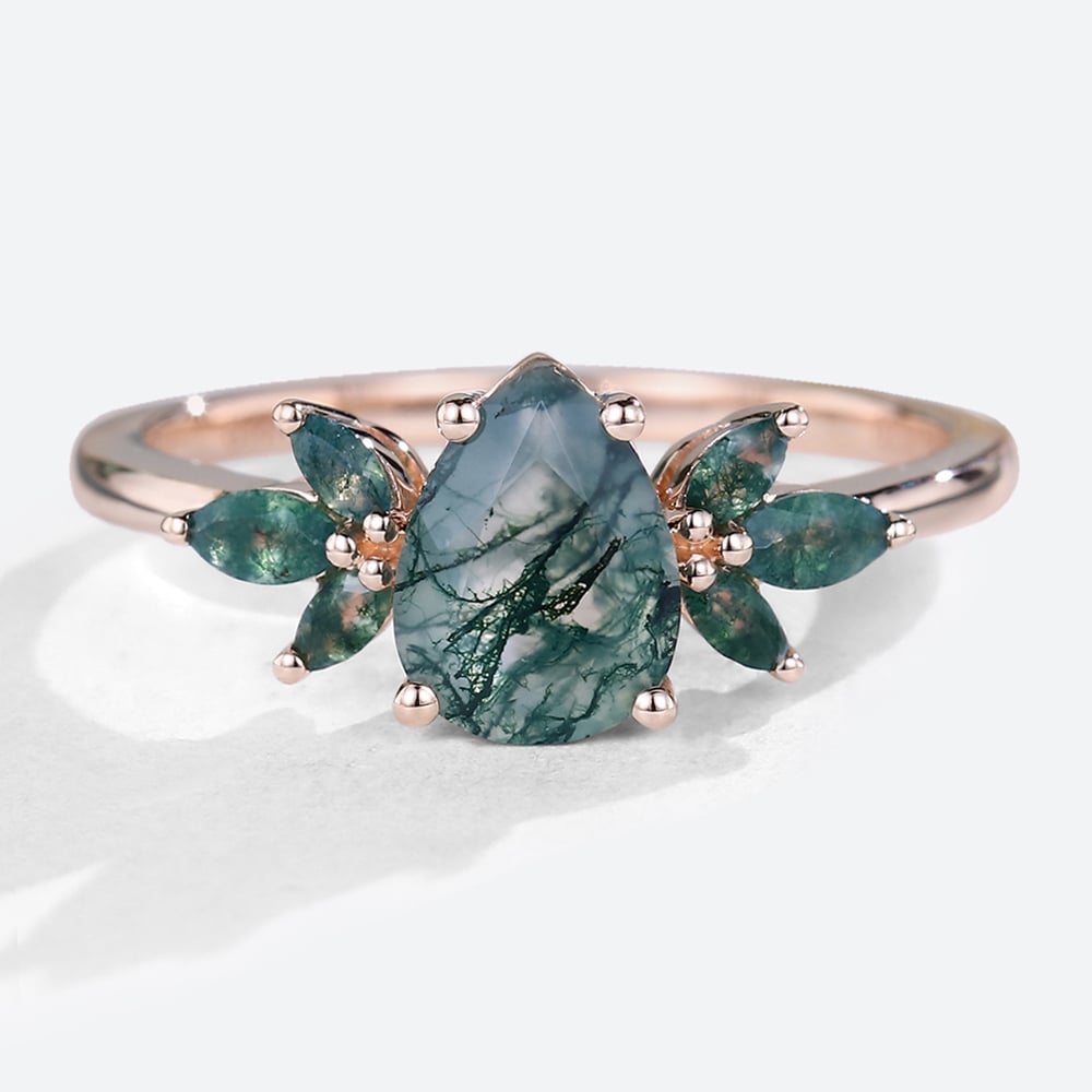 Unique Pear Moss Agate Ring Petal Side Stones Engagement Ring