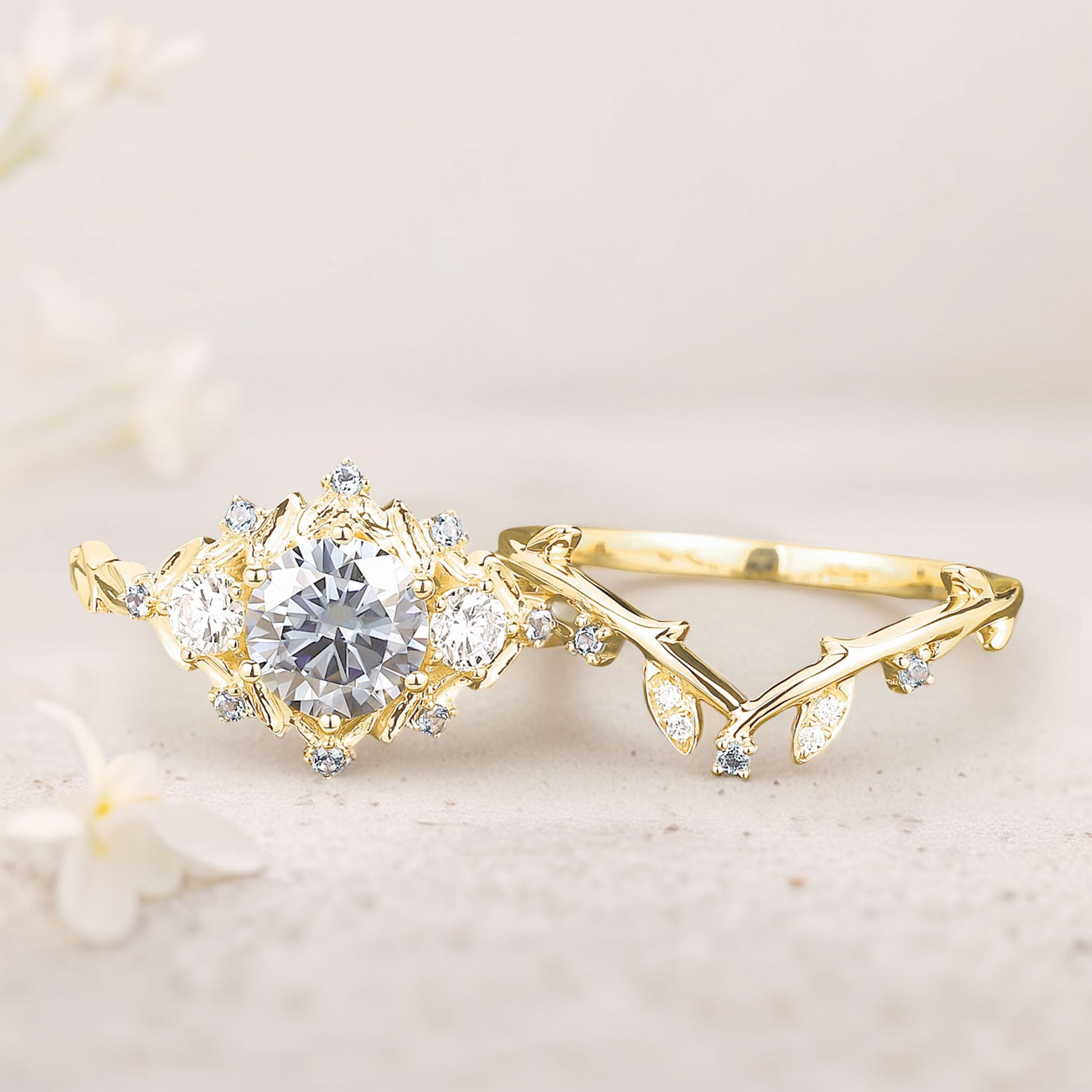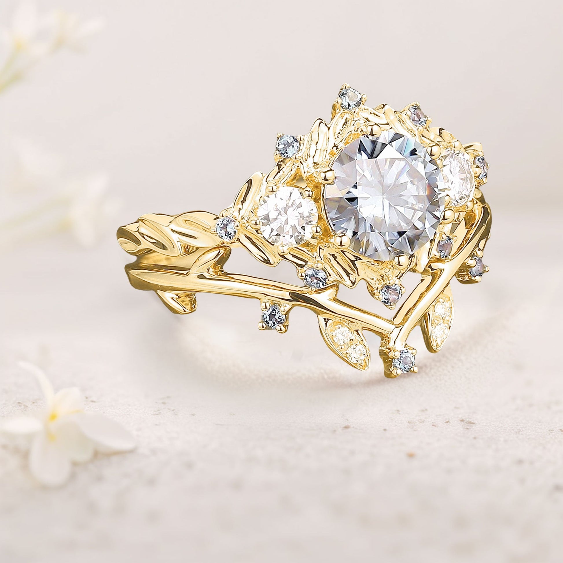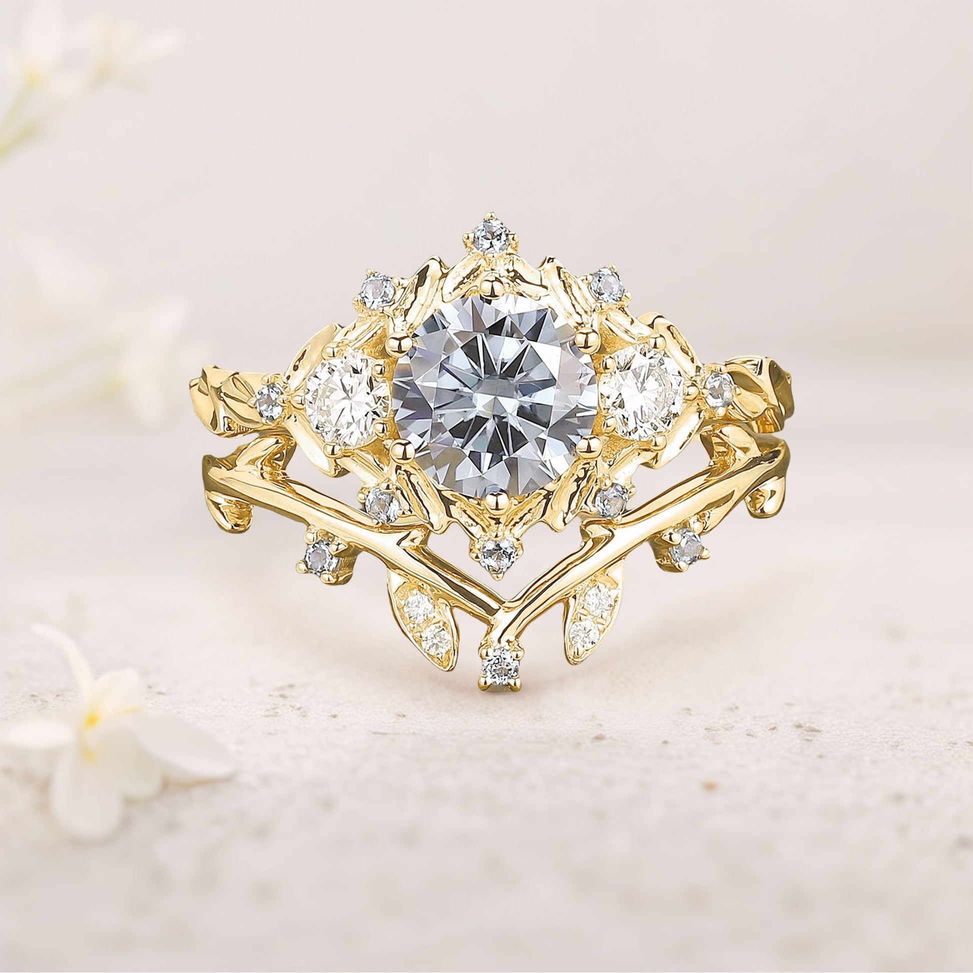 Unique Round Gray Moissanite Leaf Engagement Ring Set Bridal Promise Ring Moissanite Cluster Flower Wedding Band