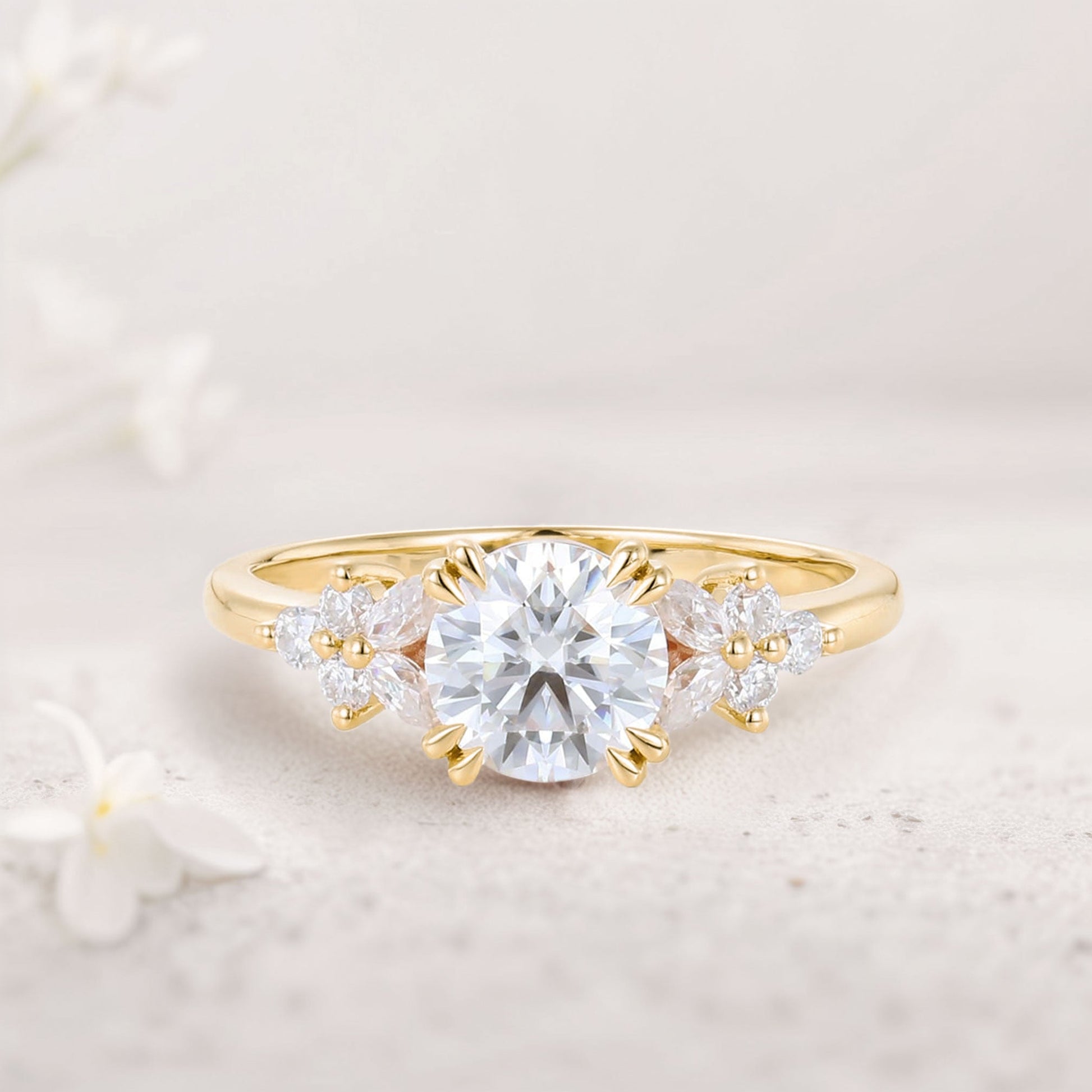 Unique Round Moissanite Floral Cluster Engagement Rings Double Prong Bridal Ring