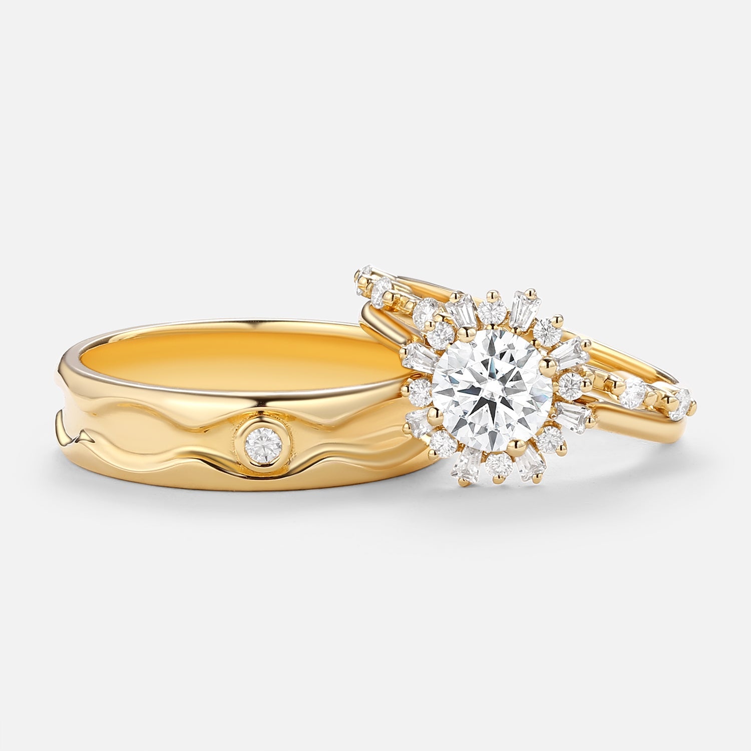 Unique Round Moissanite Halo Floral Ring Set