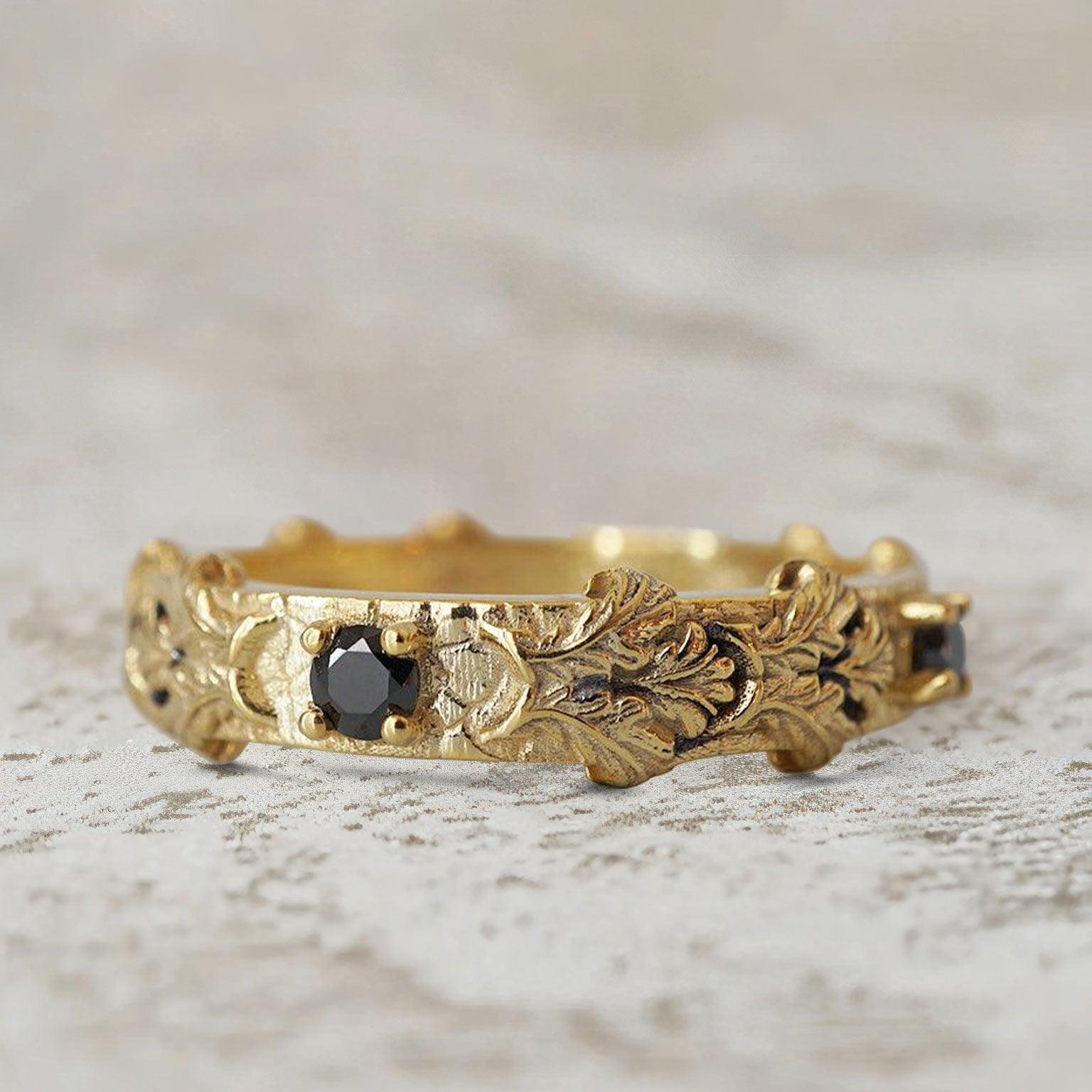 Unique Gothic Acanthus Round Black Onyx Ring Band For Men