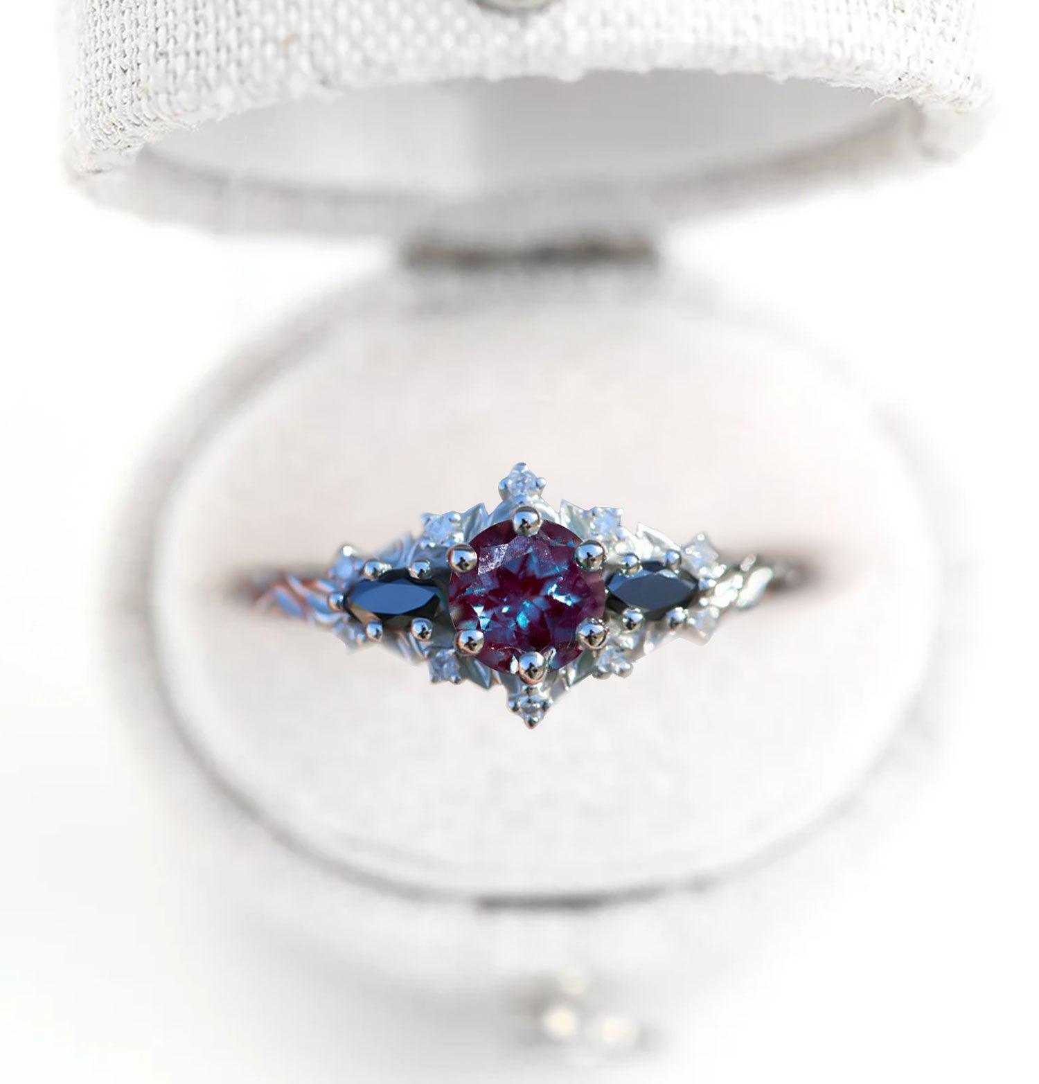 Unique Briar Rose Round Lab Alexandrite and Black Moissanite Ring