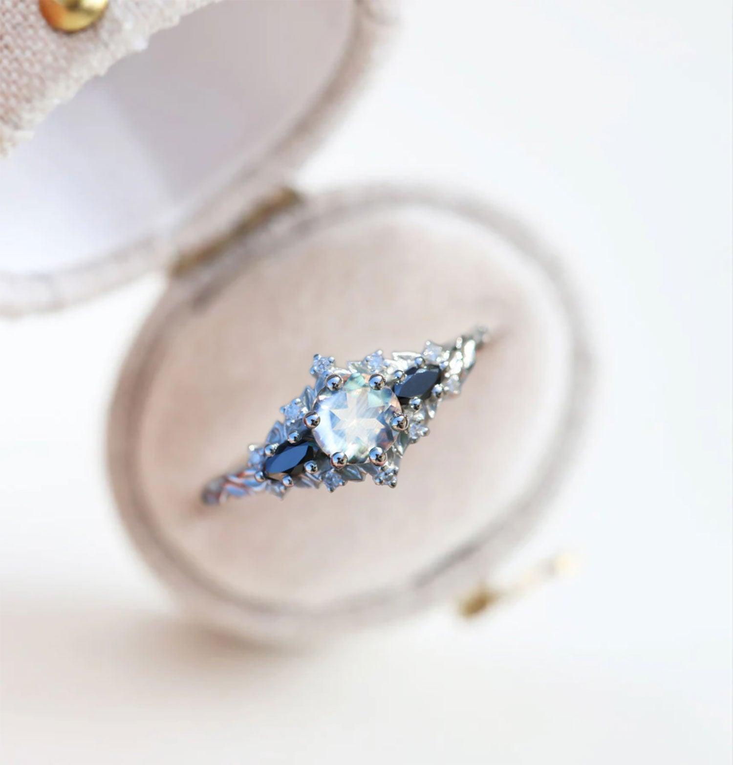 Unique Briar Rose Round Lab Moonstone and Black Moissanite Ring