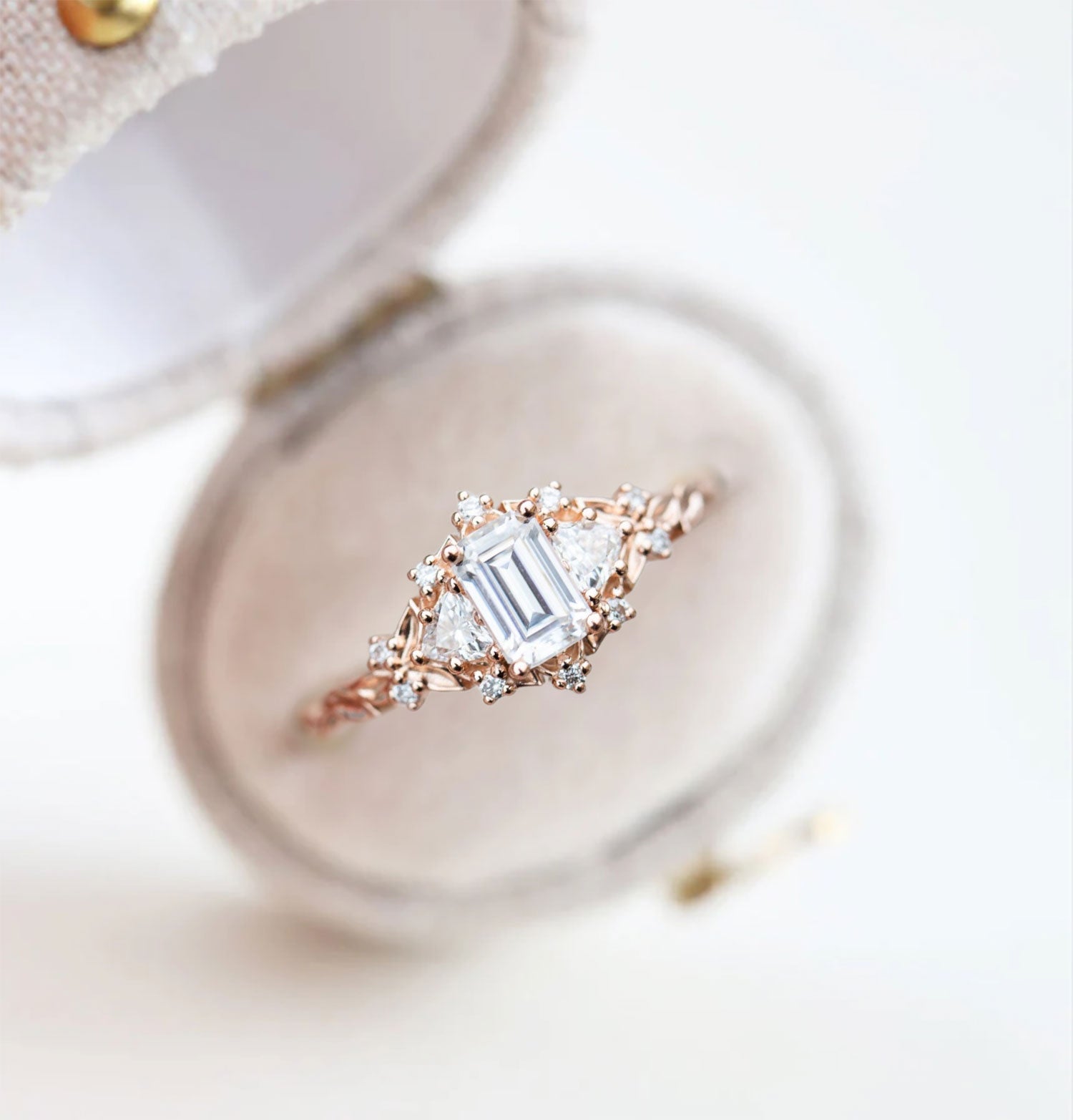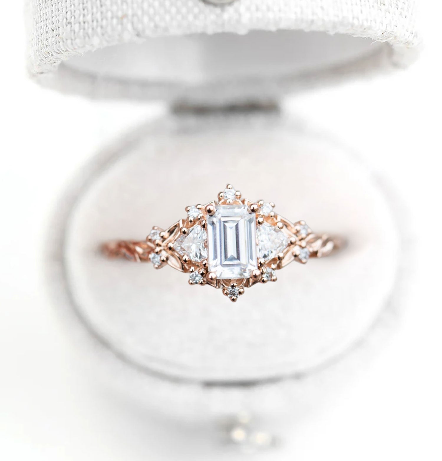 Unique Celeste Rose Three Stone Emerald cut Moissanite Ring
