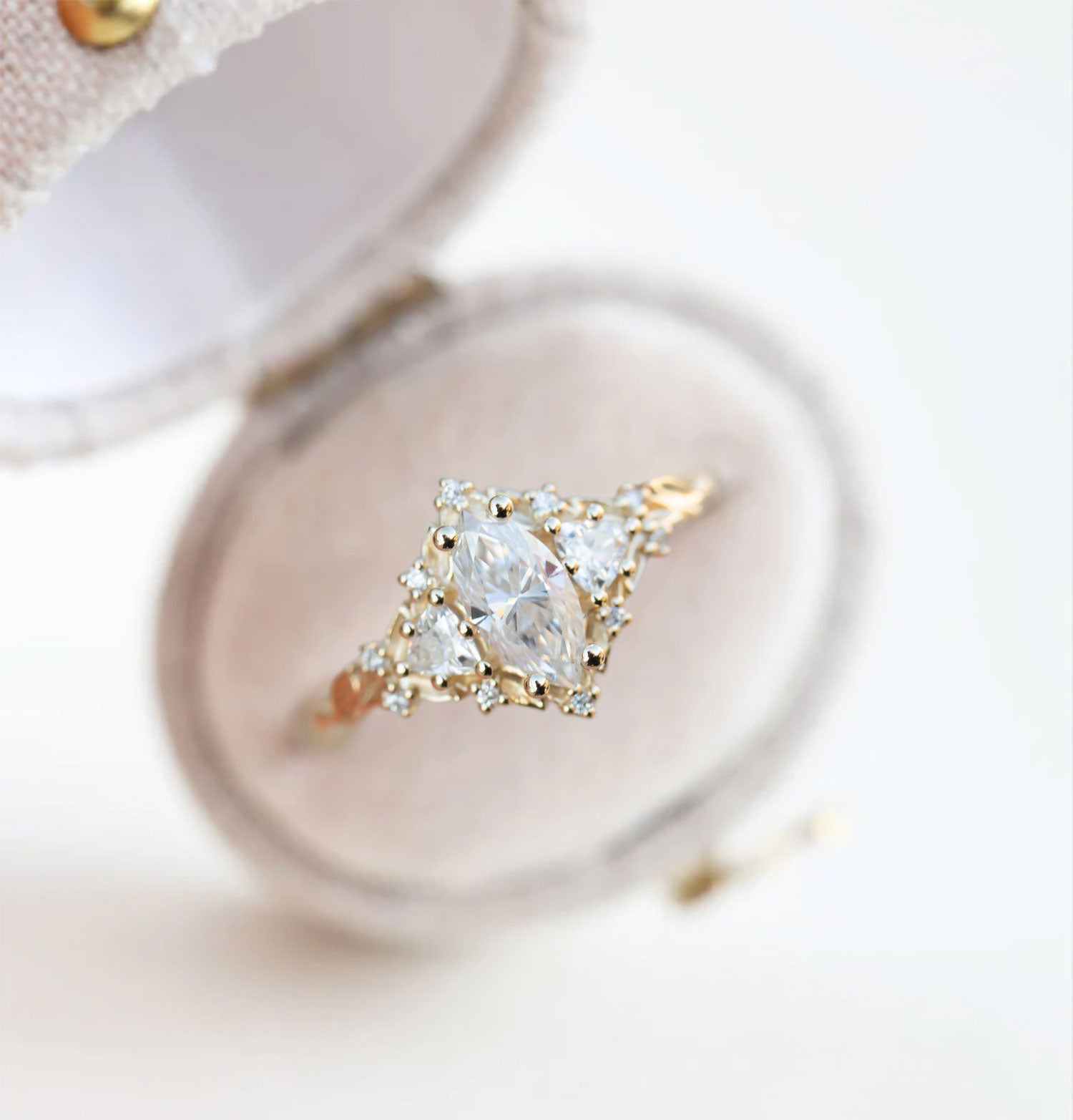 Unique Celeste Rose Three Stone Marquise Moissanite Ring
