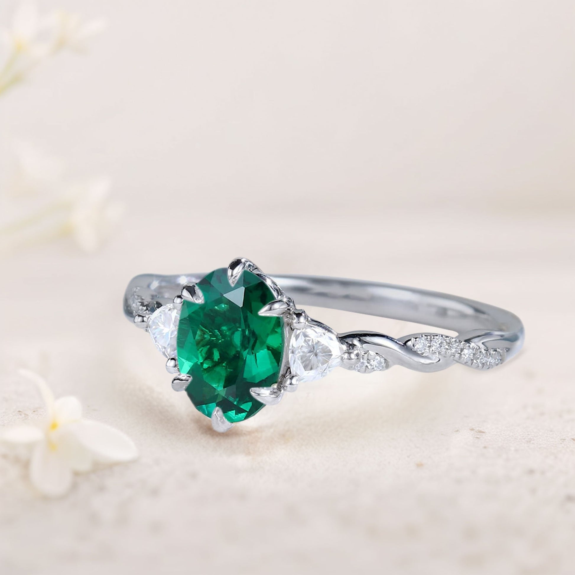 Unique Three Stone Oval Lab Emerald Ring Engagement Ring