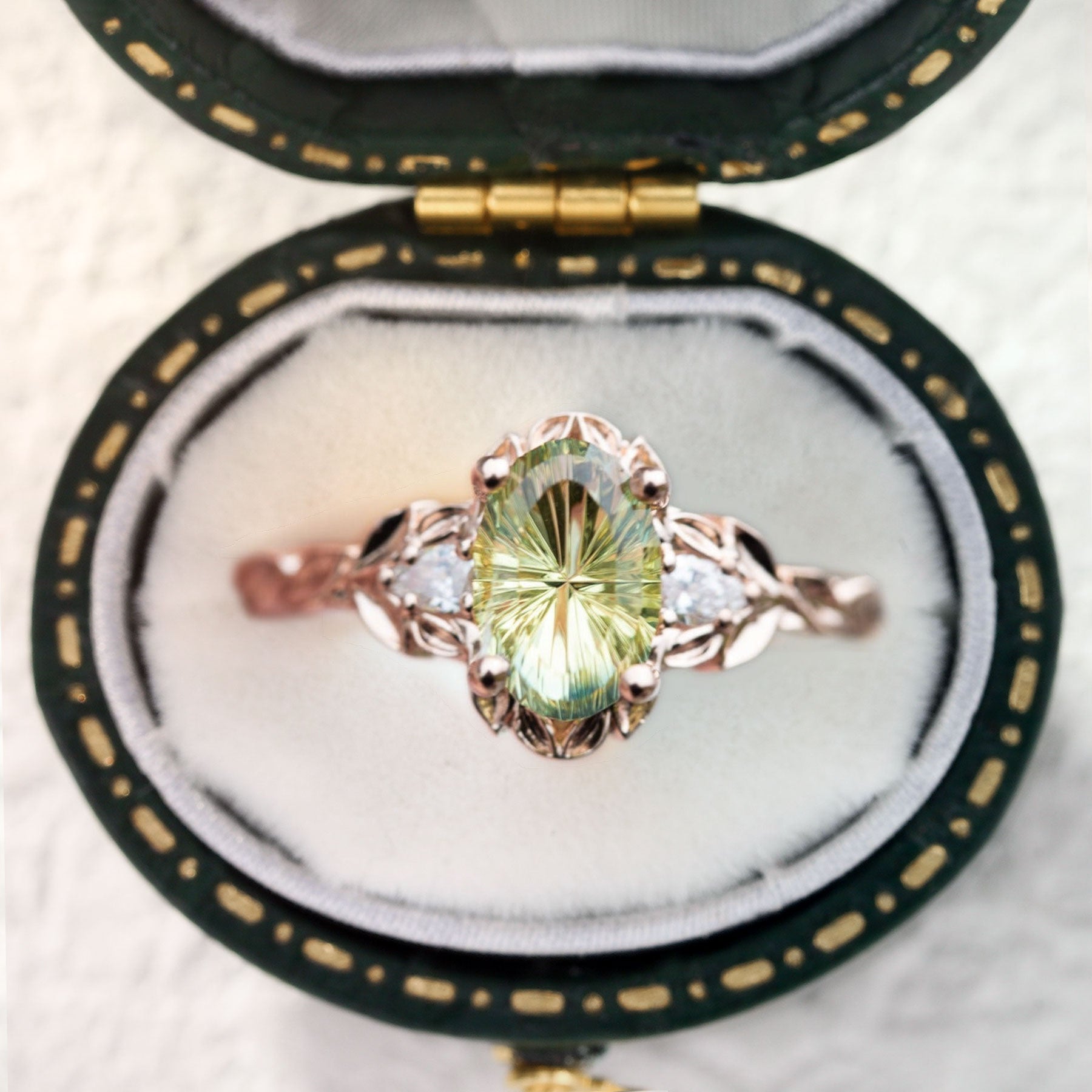 Unique Three Stone Starbrite Cut Oval Green Lab Sapphire Leafy Ring