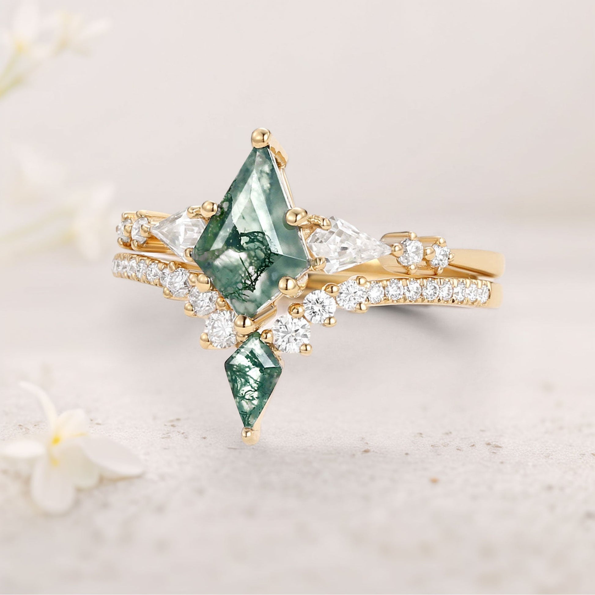 Unique floral engagement rings Twin Flames Kite Moss Agate Wedding Ring Set