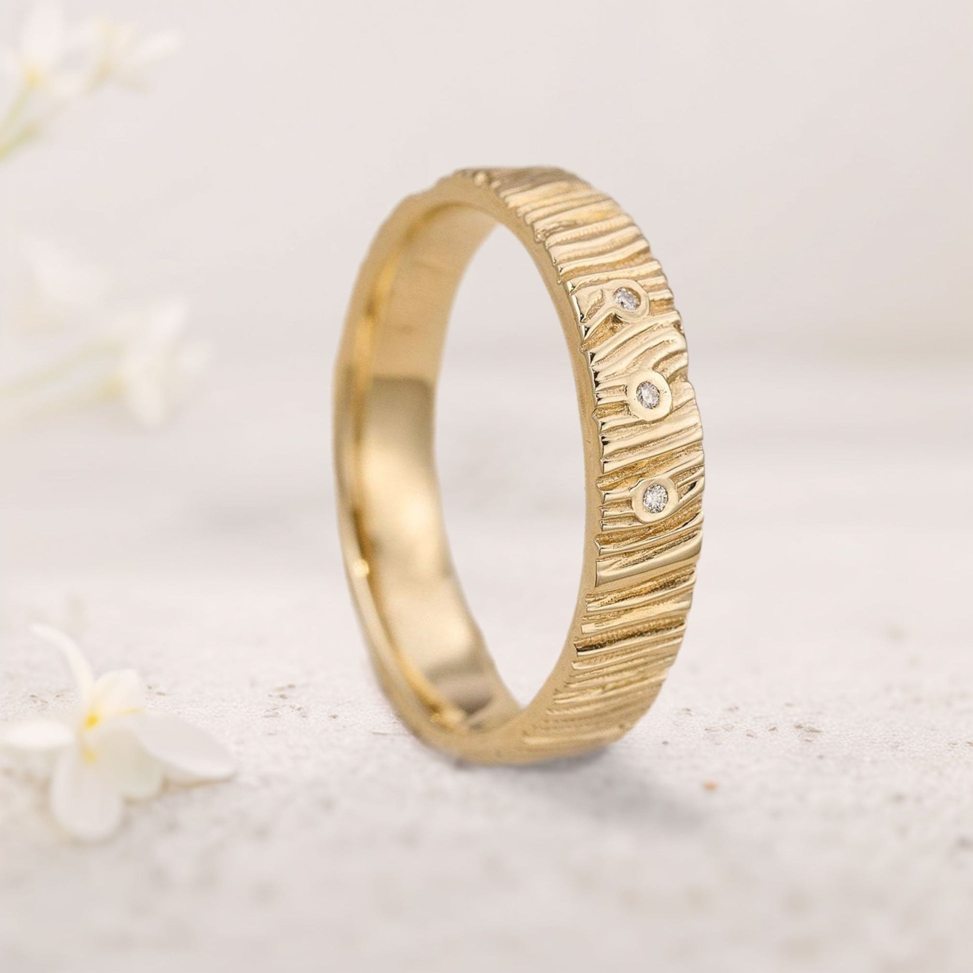 Unique floral engagement rings Wood textured wedding ring with gemstones For Men