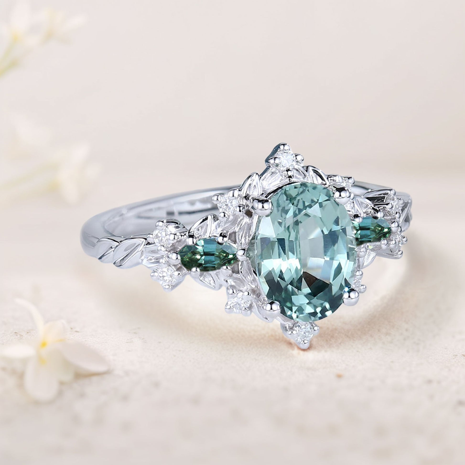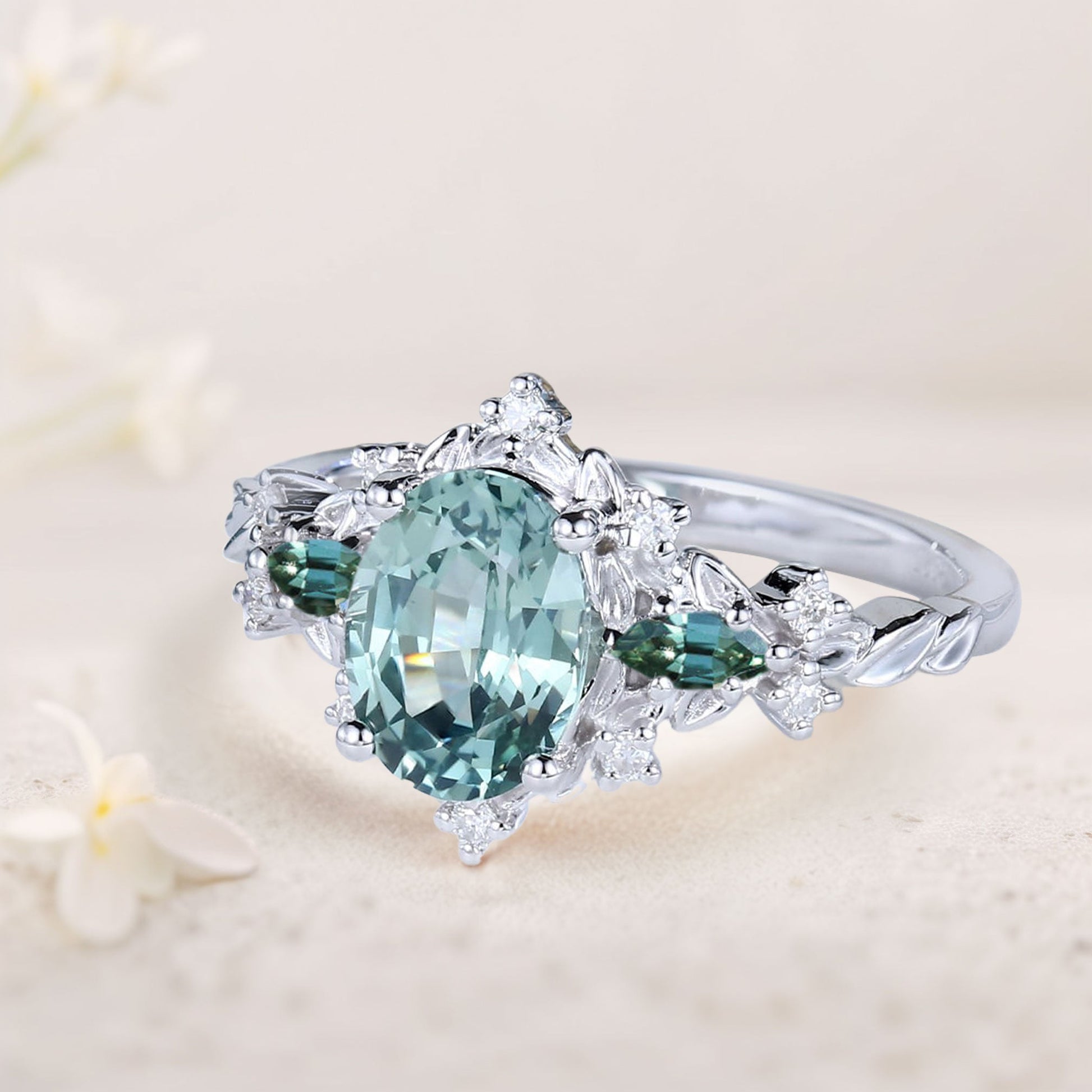 Vintage Briar Rose Oval Green Lab Sapphire and Tear Moissanite Engagement Ring Vine Ring