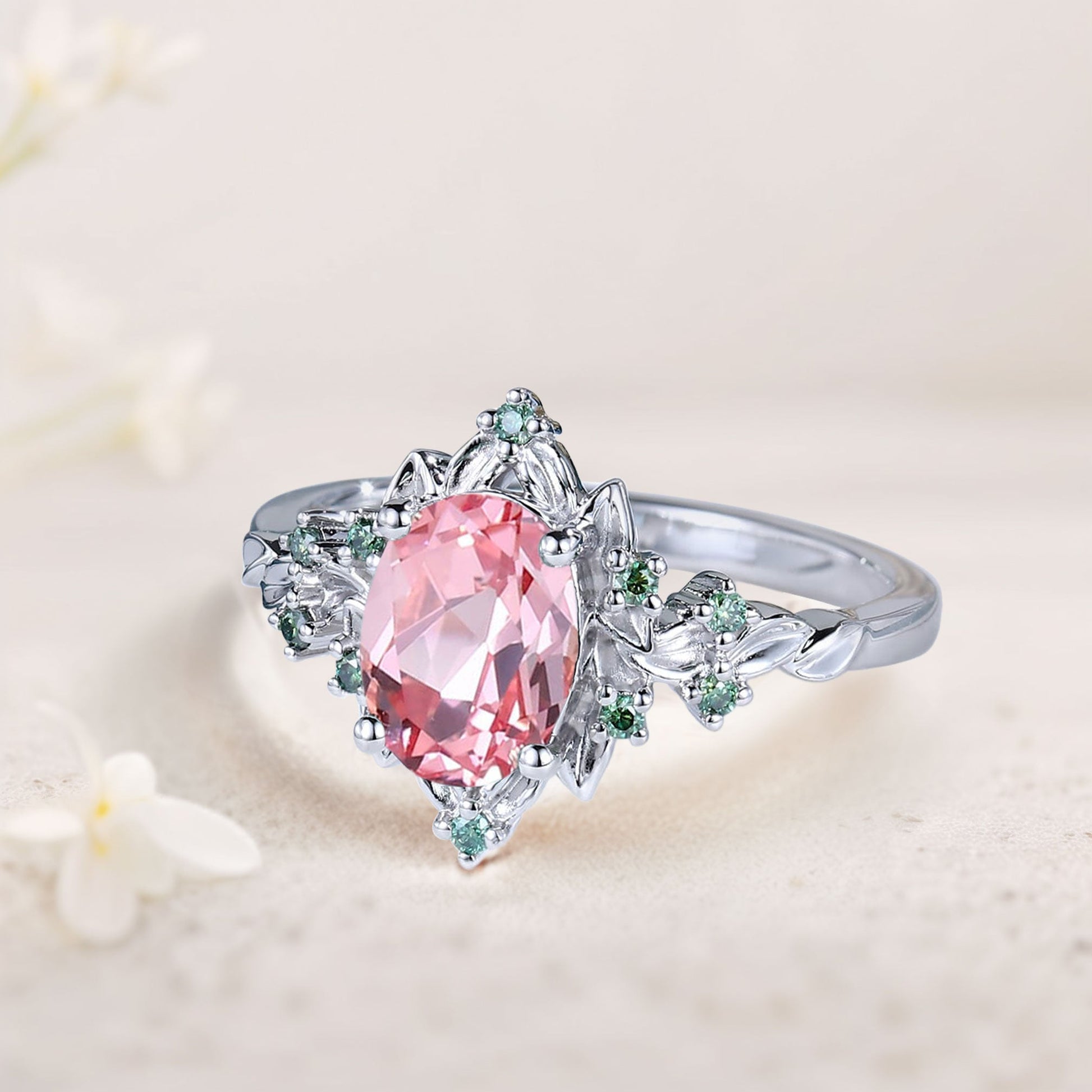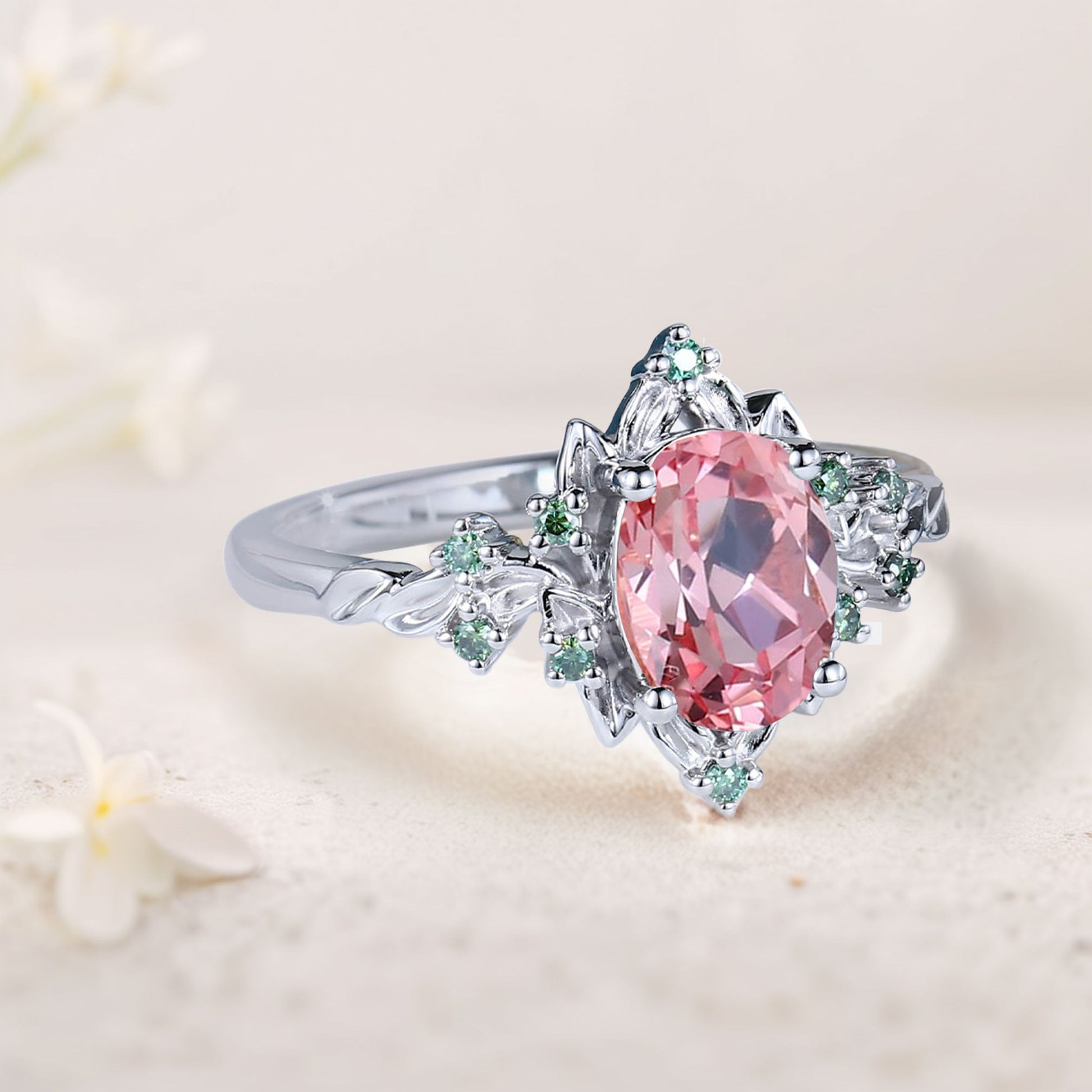 Vintage Briar Rose Oval Pink Lab Padparadscha Engagement Ring Olive Leaves Ring