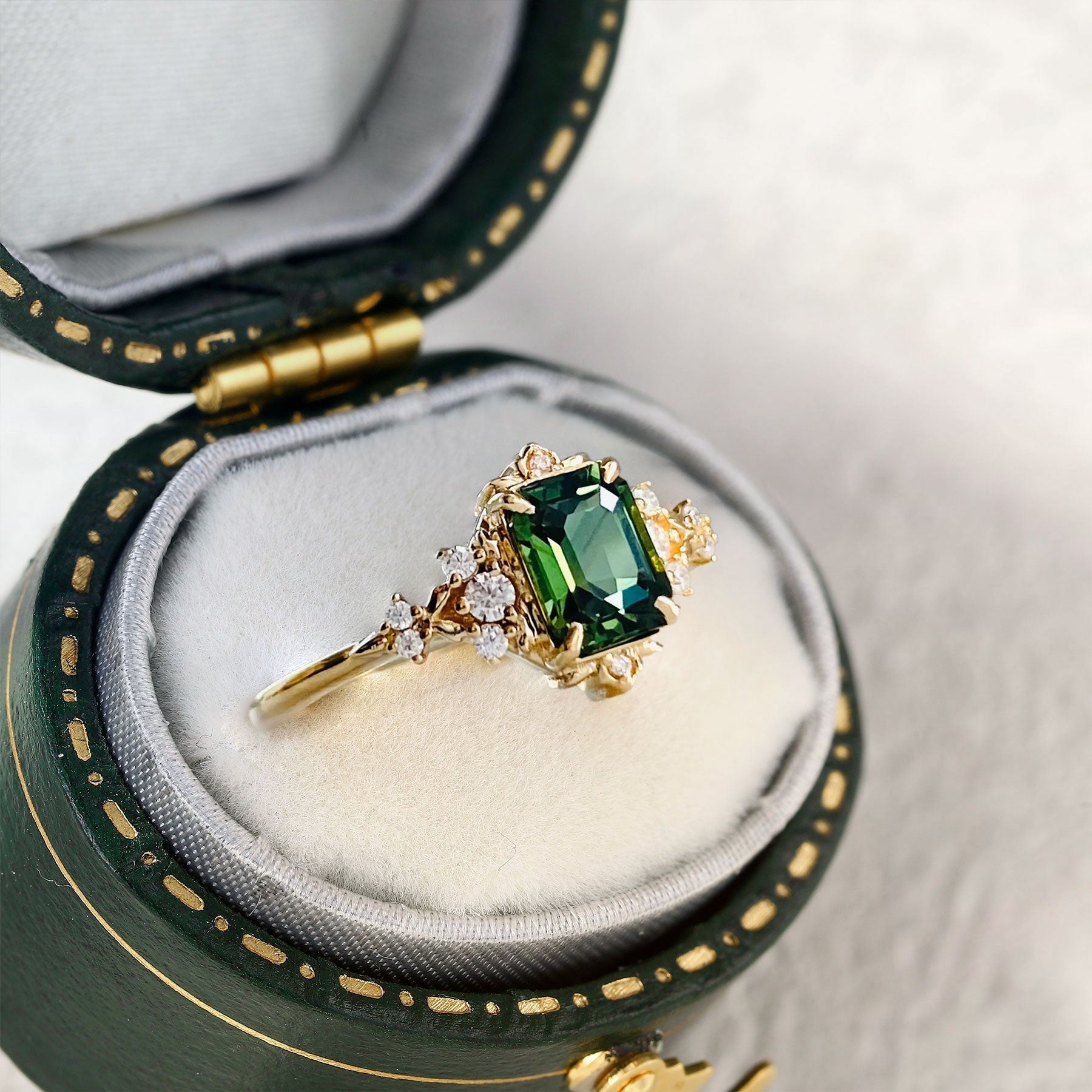 Vintage Fantasy Inspired Emerald Cut Green Lab Sapphire Engagement Ring
