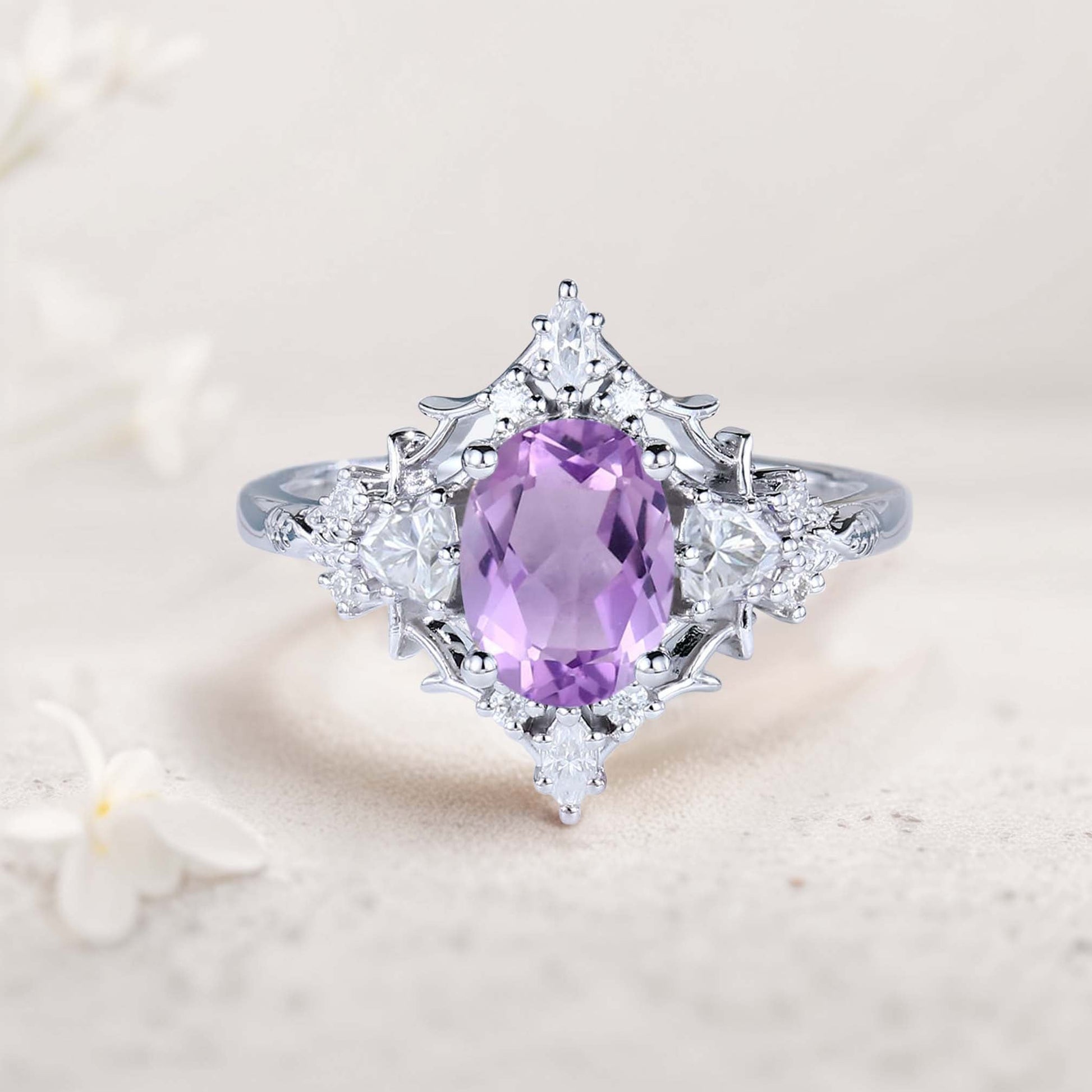 Vintage Floral Briar Rose Oval Amethyst and Moissanite Engagement Ring Filigree Ring