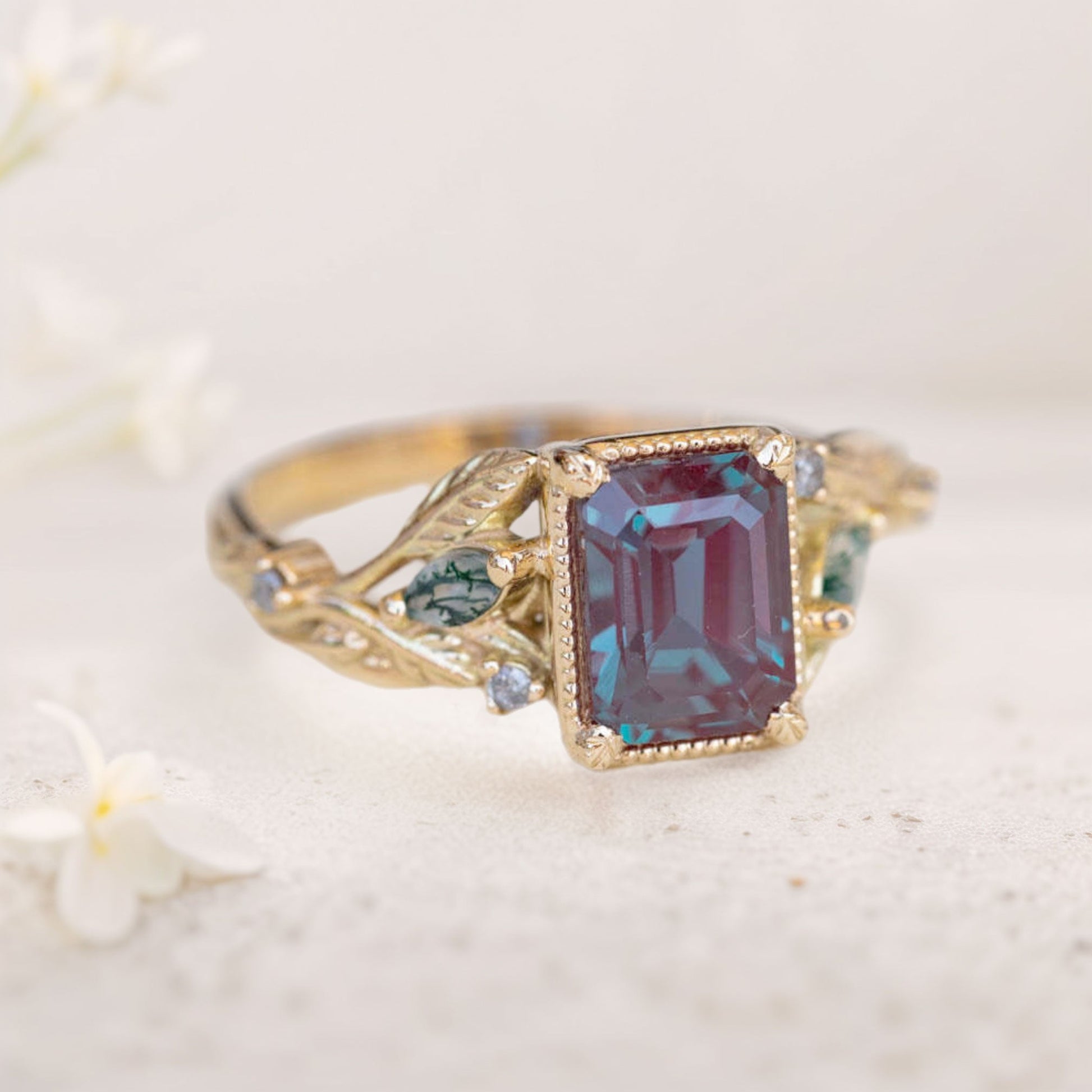 Vintage floral engagement rings Emerald cut Lab Alexandrite Engagement ring Promise ring