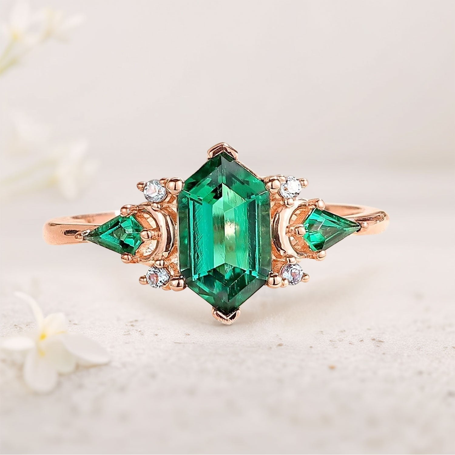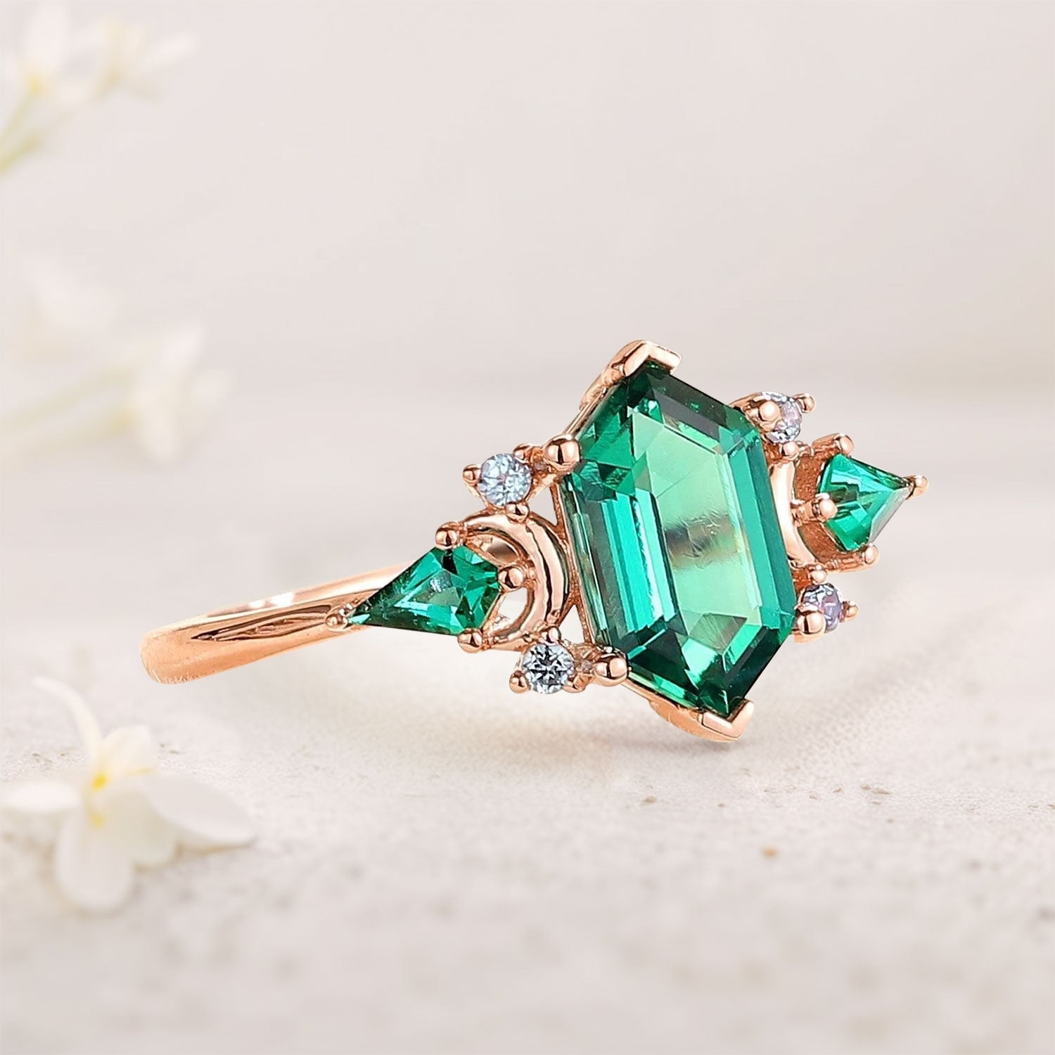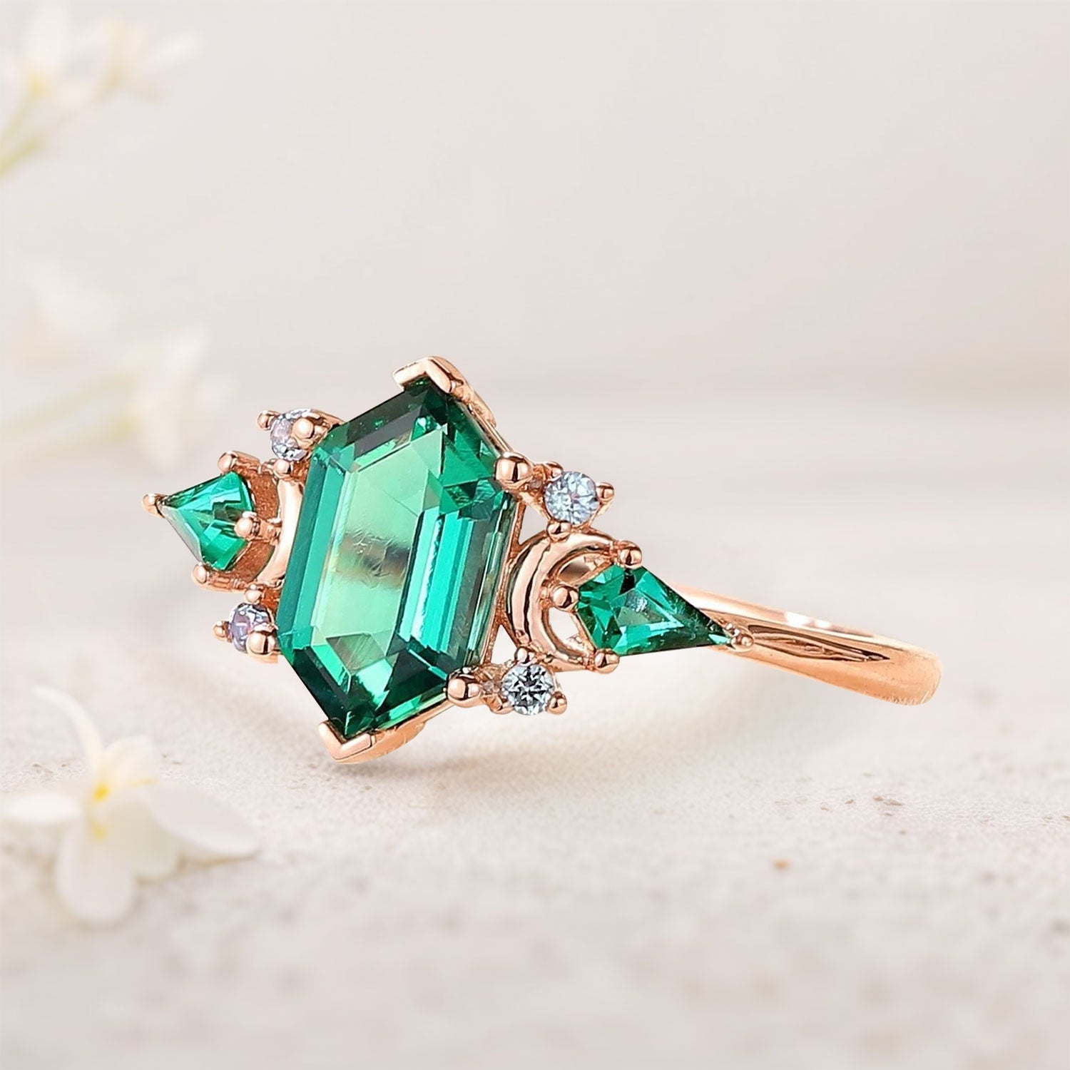 Vintage Hexagon Cut Lab Emerald Engagement Ring Unique Kite Cut Moon Design Promise Ring Gift for Women