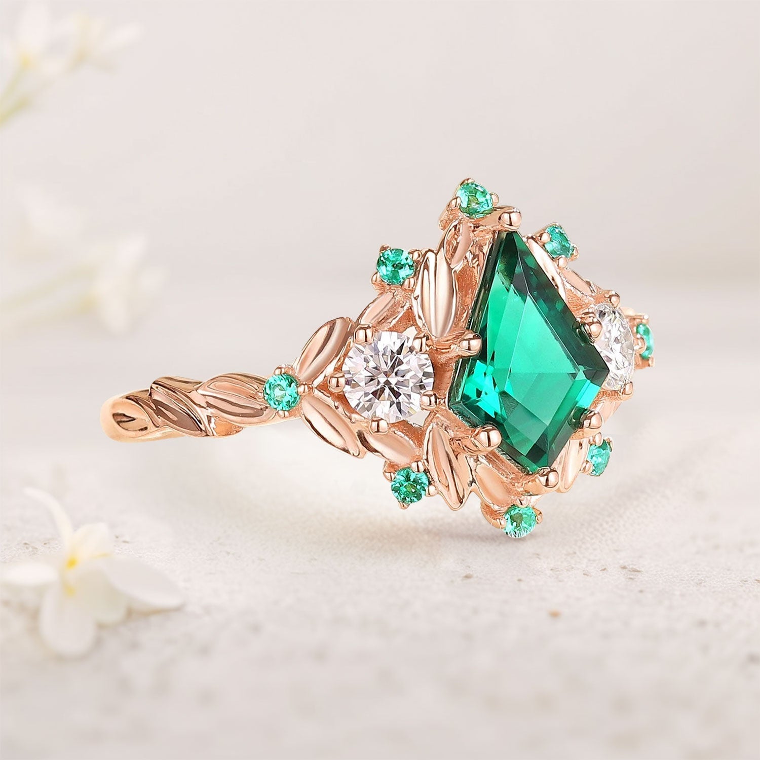 Vintage Kite Lab Emerald Ring Three Stone Ring Floral Branch Engagement Ring Dainty Emerald Cluster Wedding Ring Bridal Ring