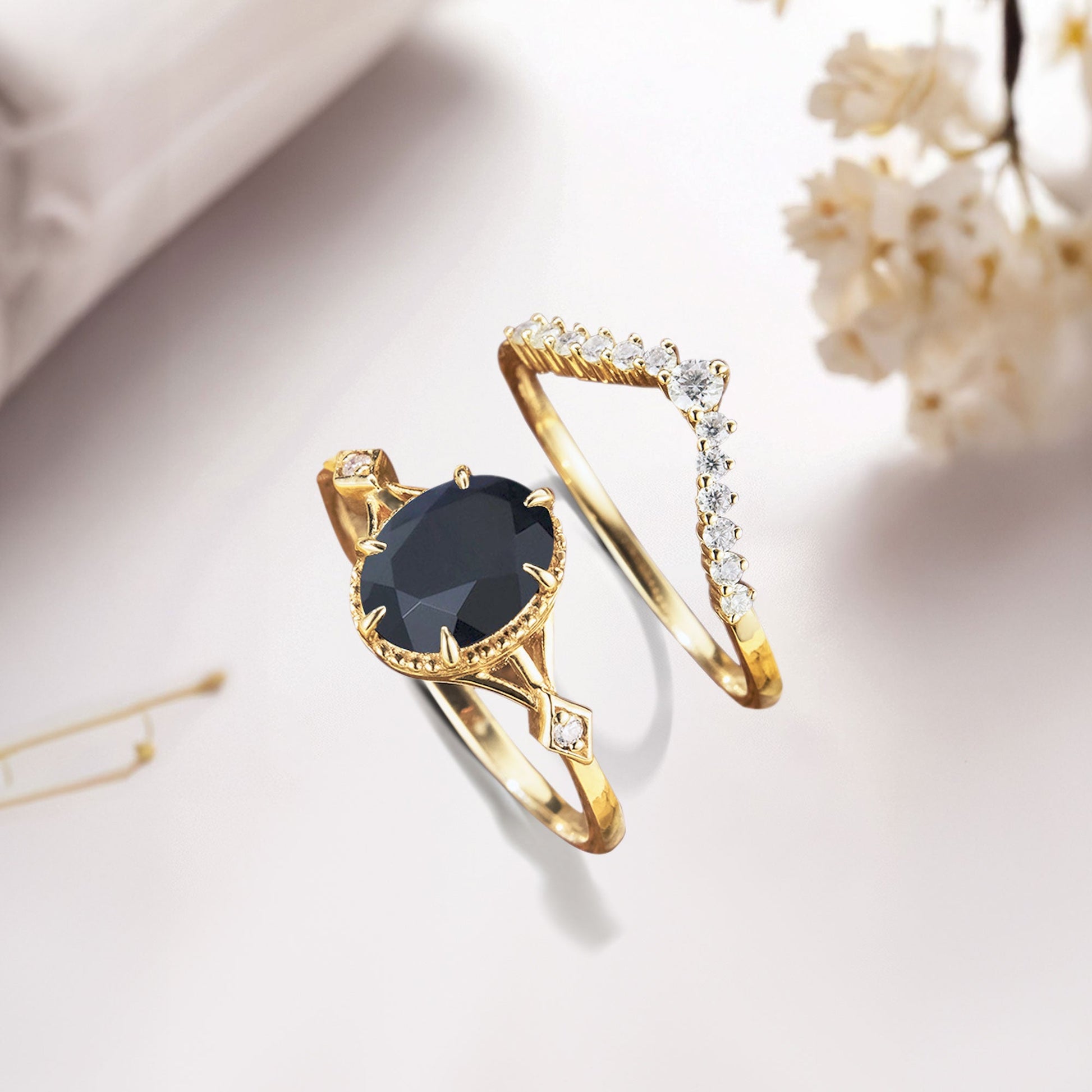 Vintage Oval Black Onyx and Moissanite Bridal Set