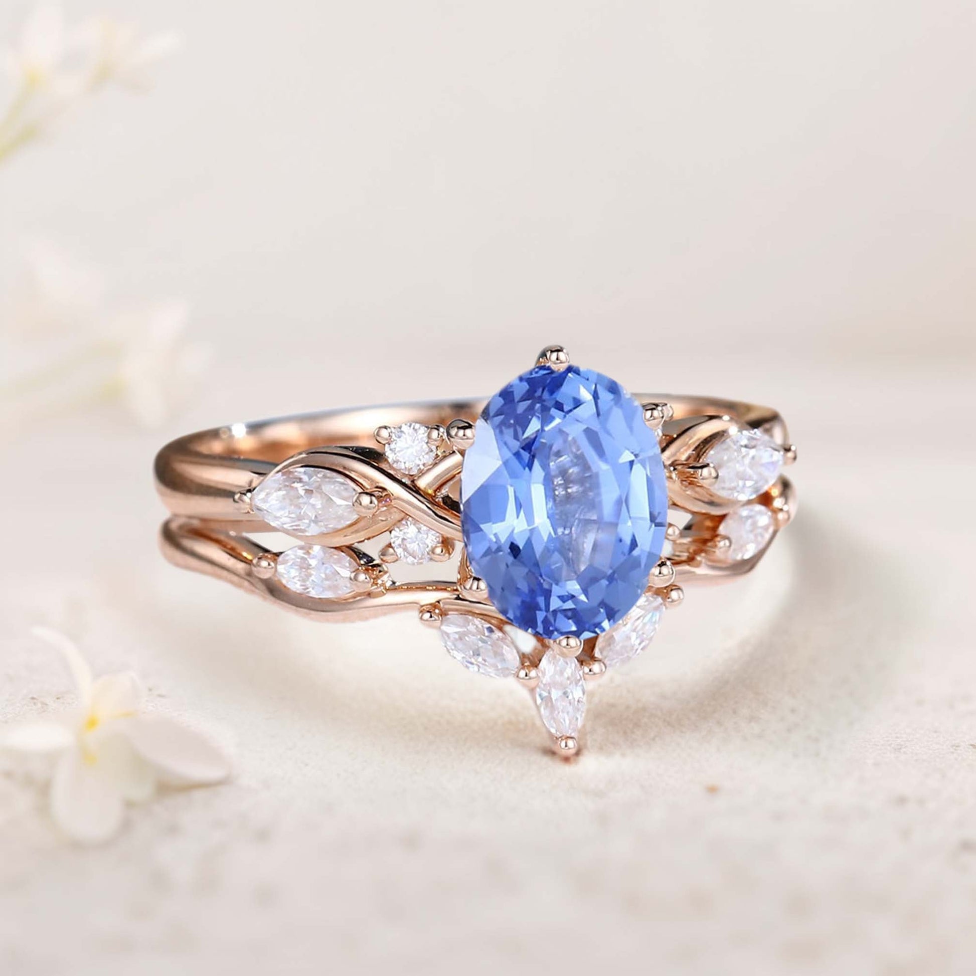 Vintage Oval Lab Sapphire and Moissanite Curved Wedding Ring Set Bridal Ring Set