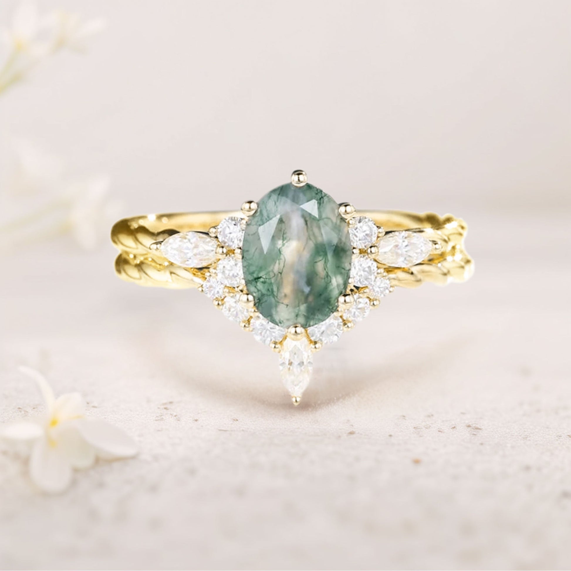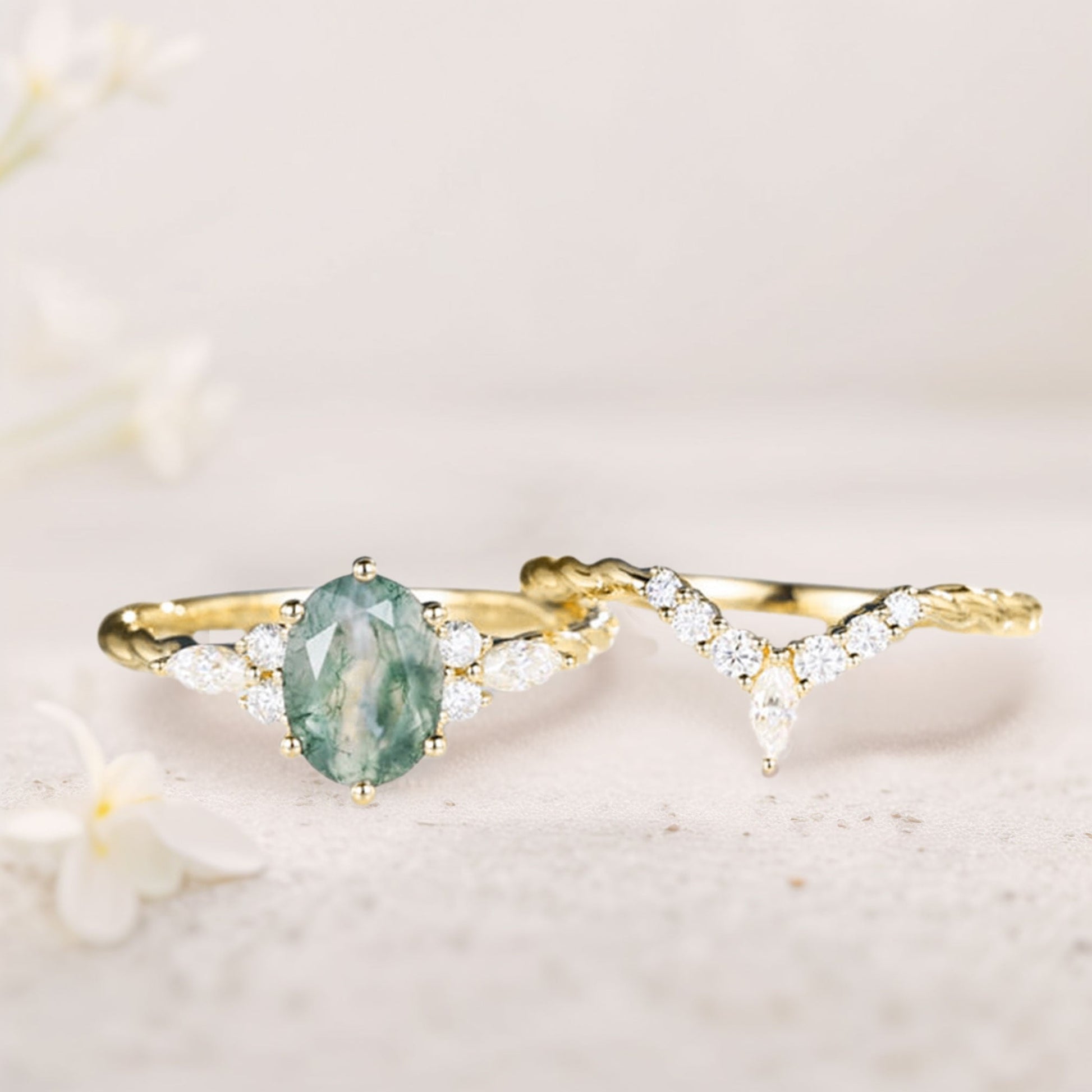 Vintage Oval Moss Agate Twisted Engagement Ring With Curved Wedding Ring Set