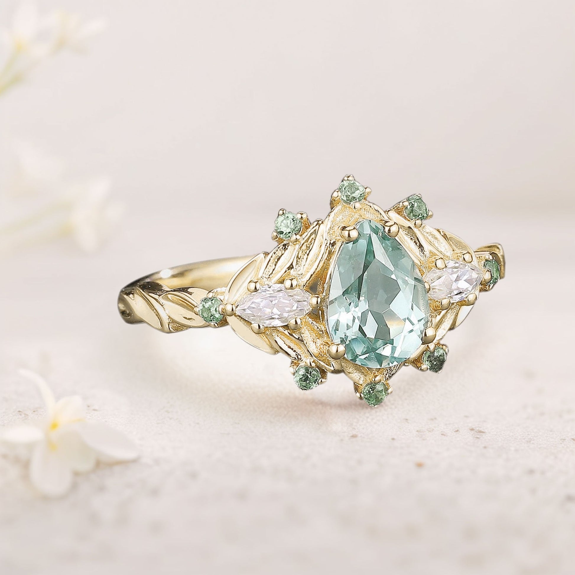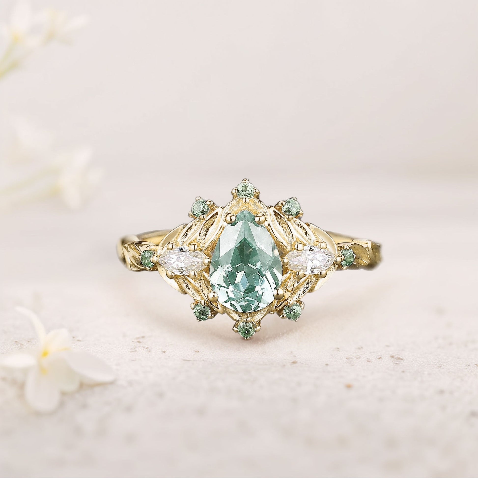 Vintage Pear Green Lab Sapphire Engagement Ring Cluster Bouquet Promise Ring