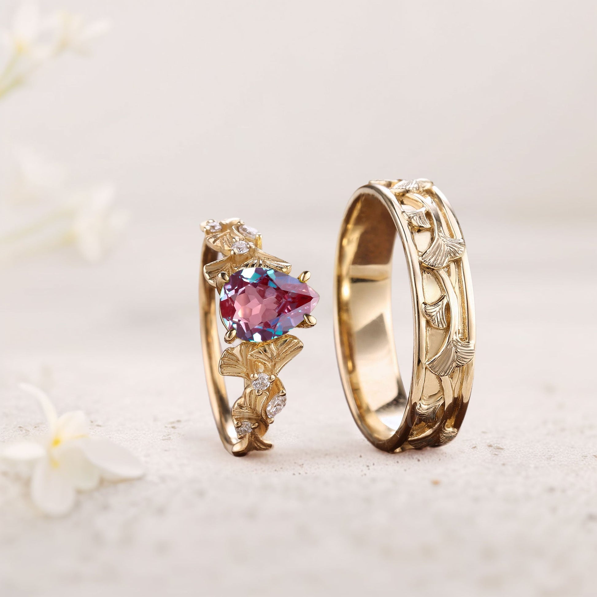 Vintage Pear Lab Alexandrite Engagement Couples Ring Set For Wedding Gift