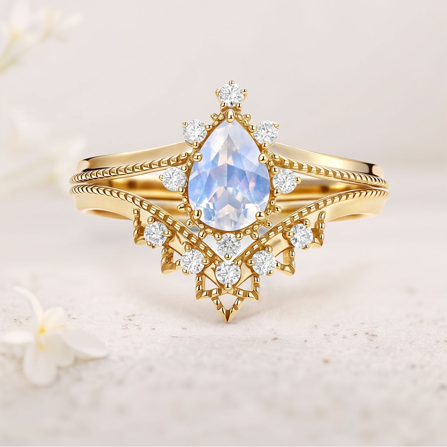 Vintage Pear Lab Moonstone and Moissanite Chevron Ring Set Bridal Set