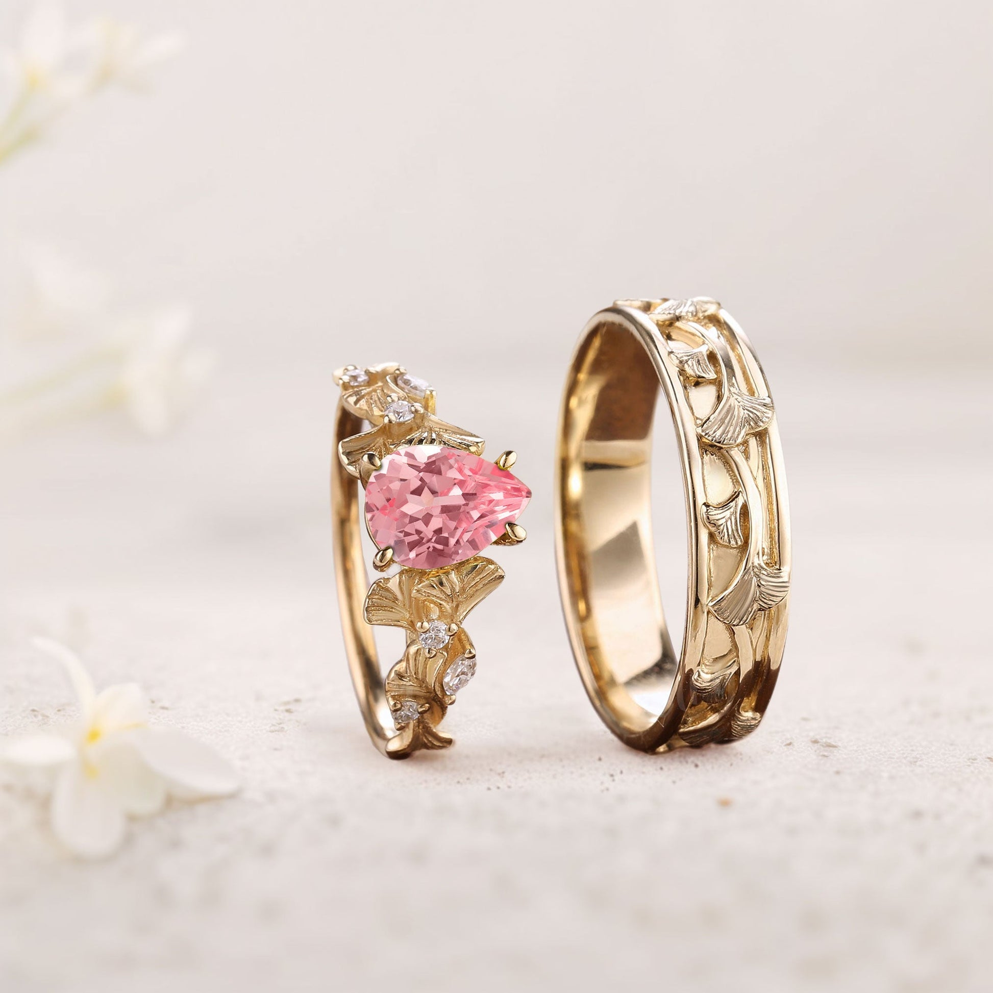 Vintage Pear Lab Padparadscha Engagement Couples Ring Set For Wedding Gift