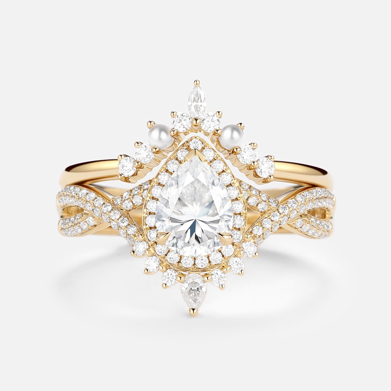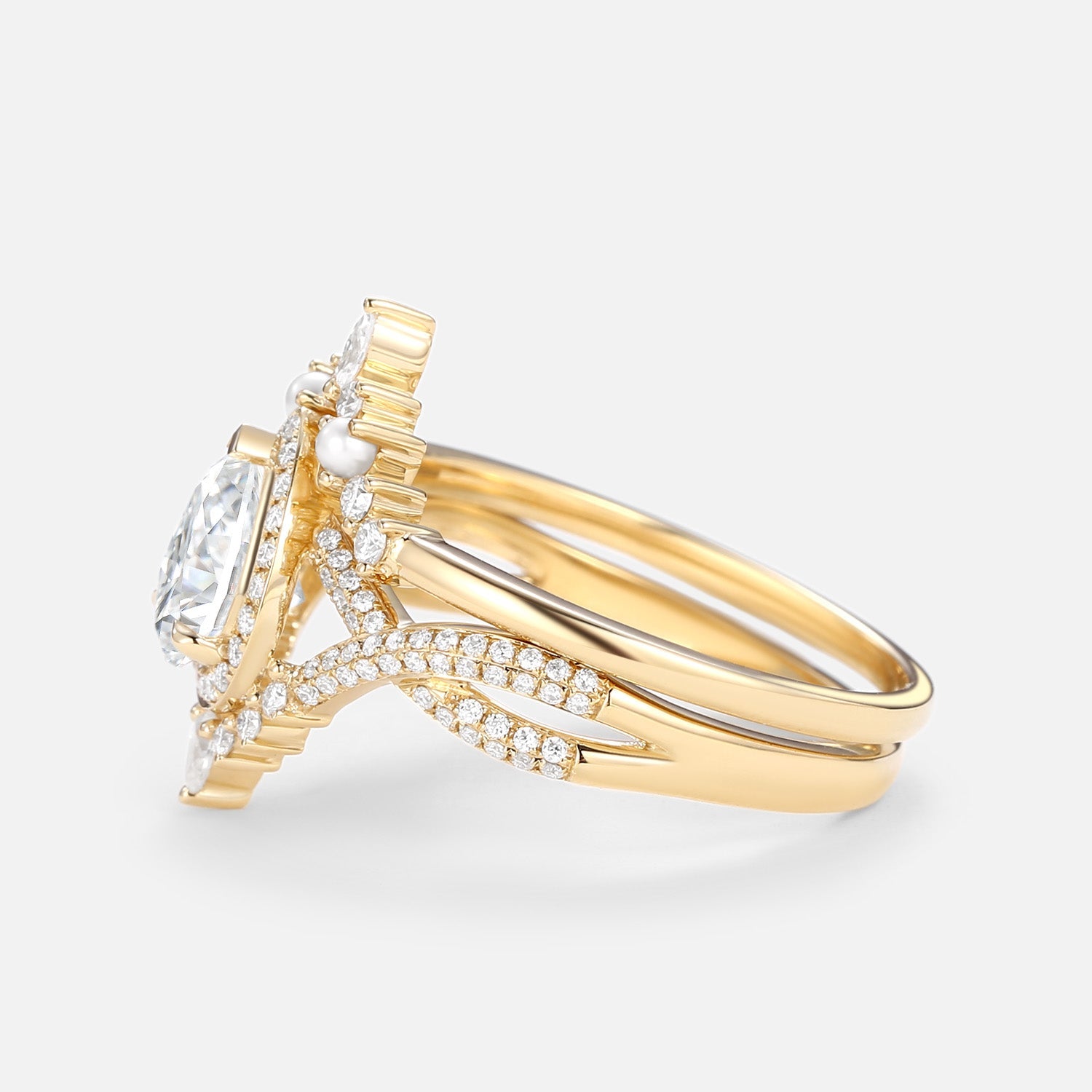 Vintage floral engagement rings Pear Moissanite and Pearl Halo Infinity Ring Set