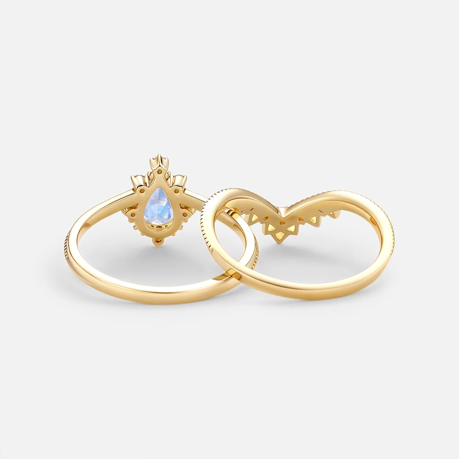 Vintage Pear Moonstone and Moissanite Chevron Ring Set Bridal Set