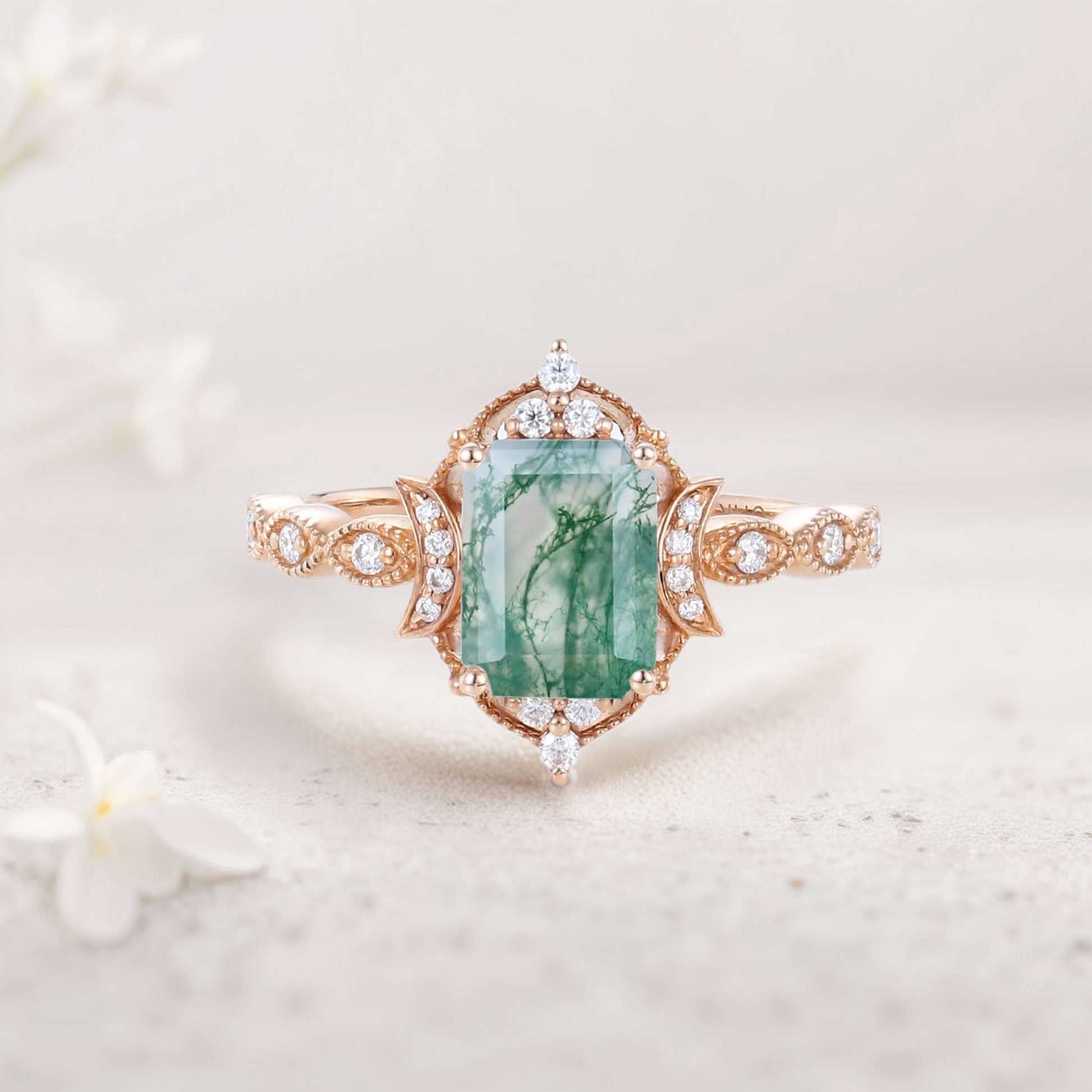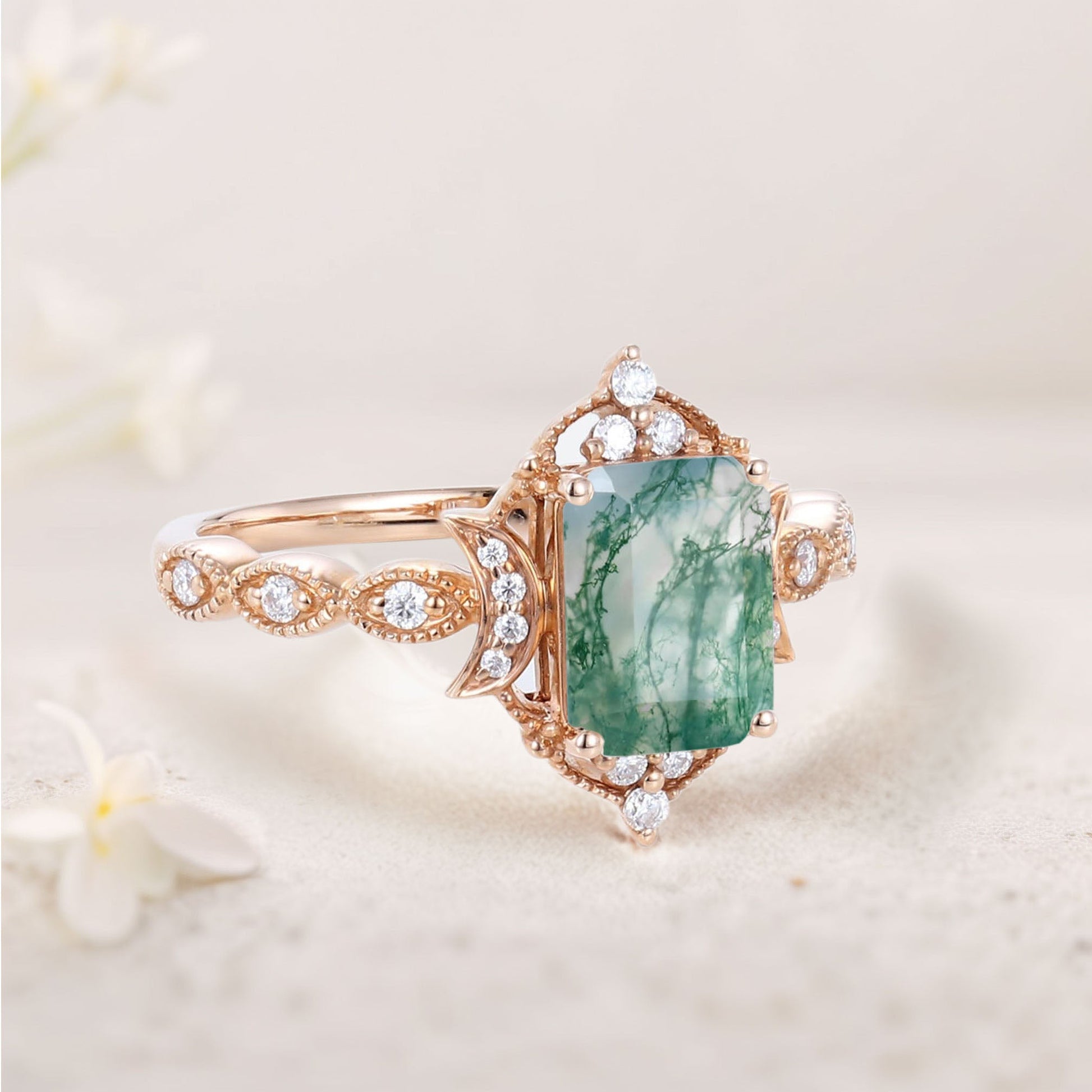 Vintage Emerald cut Moss Agate Engagement Ring Whimsical Charm Bridal Ring
