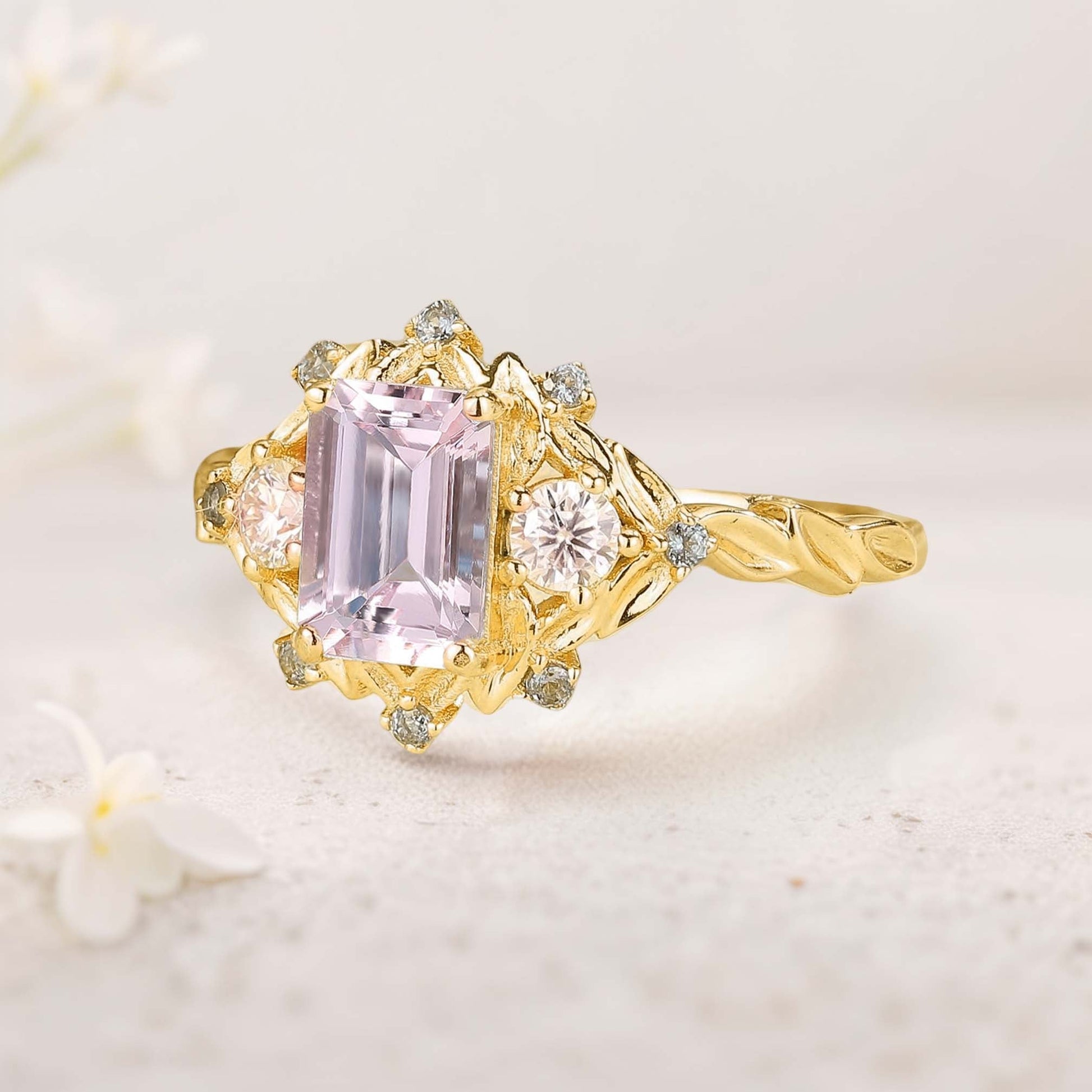 Vintage Three Stone Emerald cut Lab Morganite Engagement ring Fairy ring