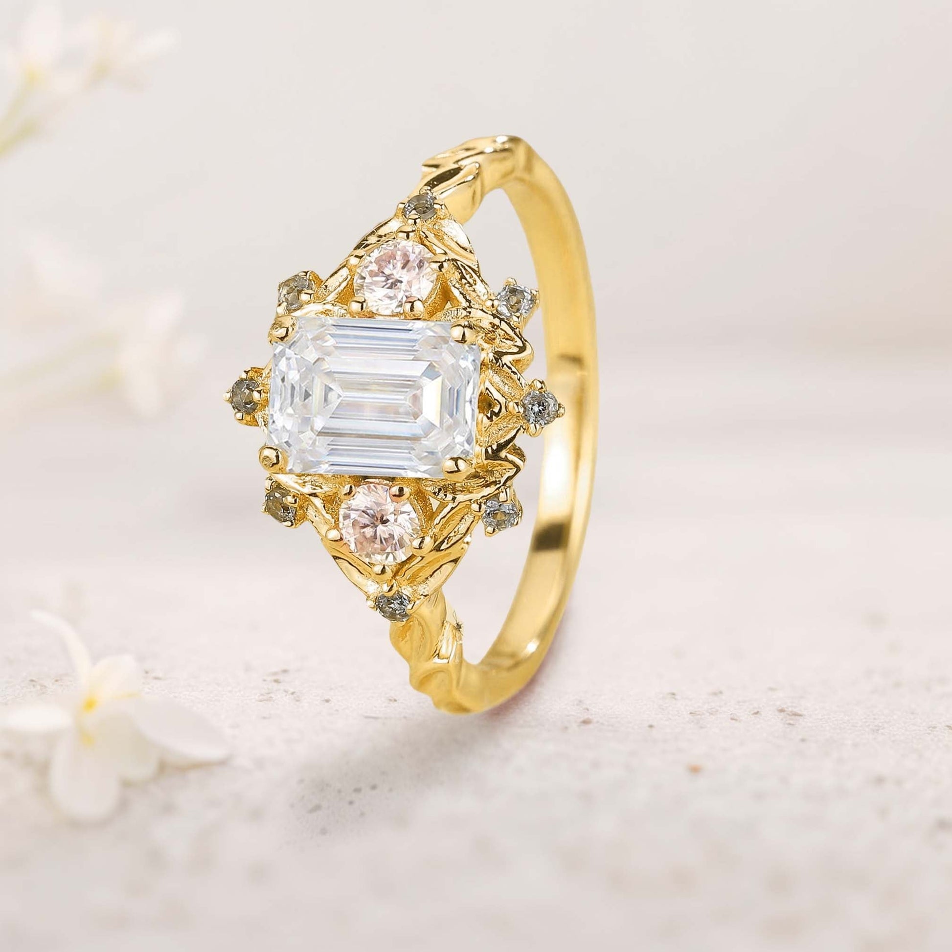 Vintage floral engagement rings Three Stone Emerald cut Moissanite ring Promise ring